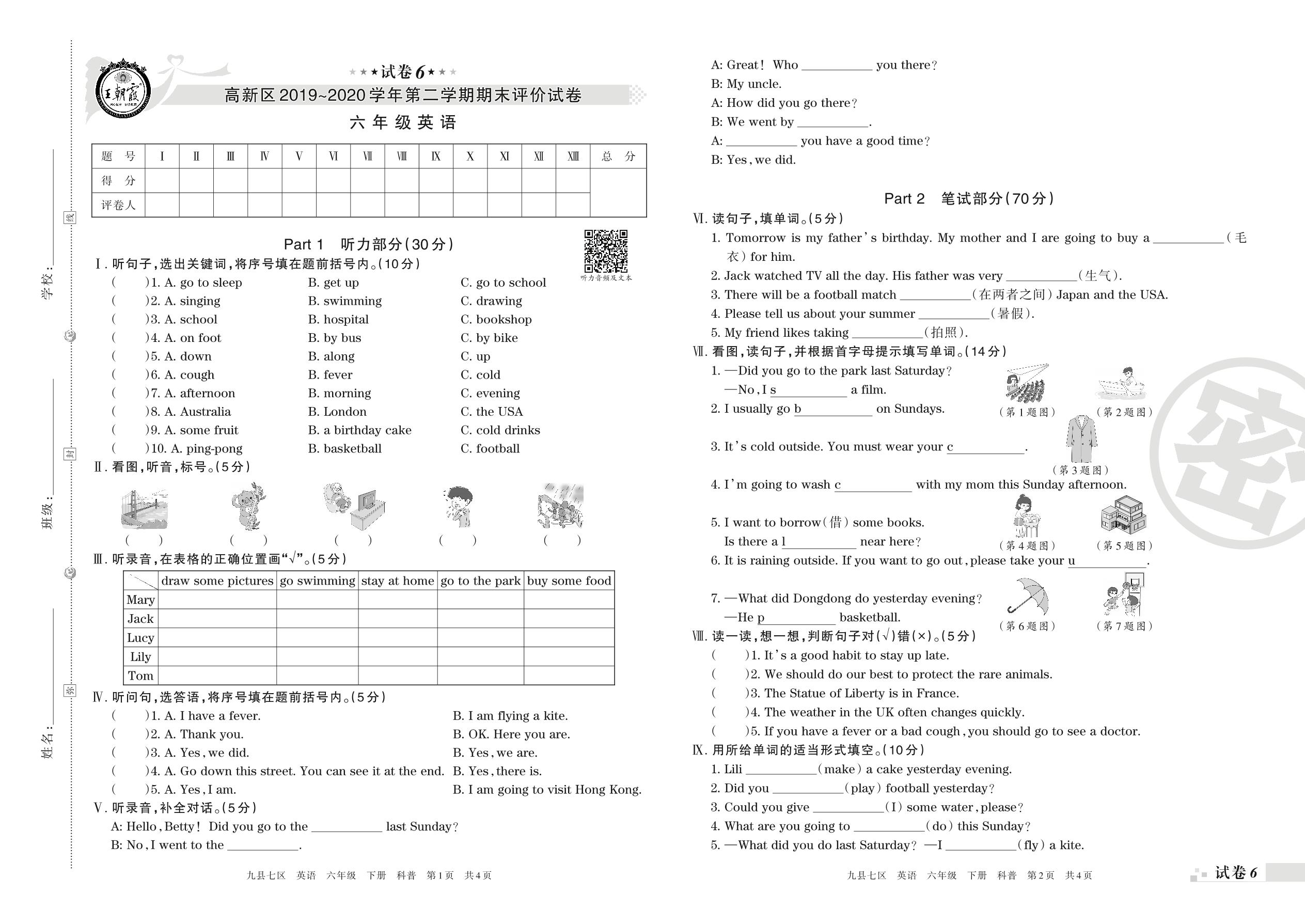 2019-2020学年第二学期洛阳市高新区六年级英语试卷(科普版)【6】