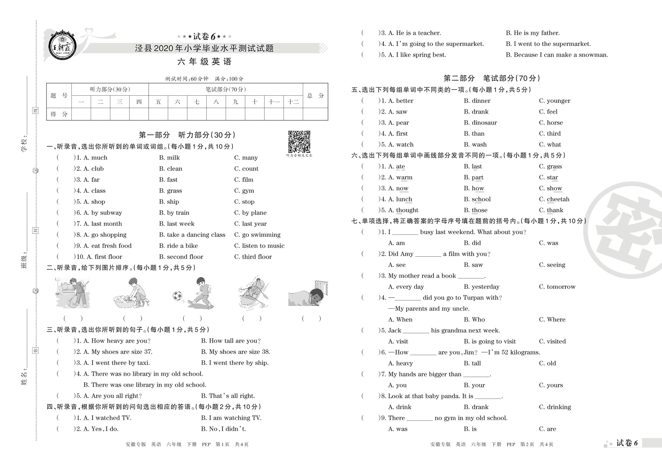 2019-2020学年第二学期宣城市泾县六年级英语试卷(PEP版)【6】