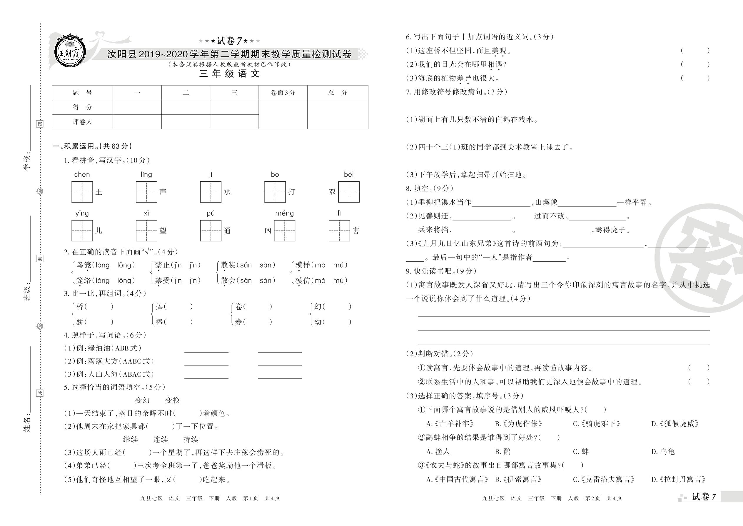 2019-2020学年第二学期洛阳市汝阳县三年级语文试卷(人教版)【7】