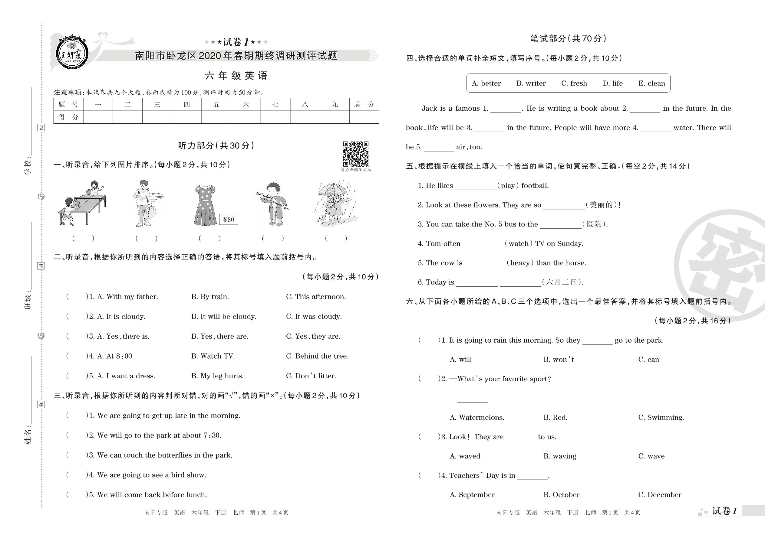 2019-2020学年第二学期南阳市卧龙区六年级英语试卷(北师版)【1】