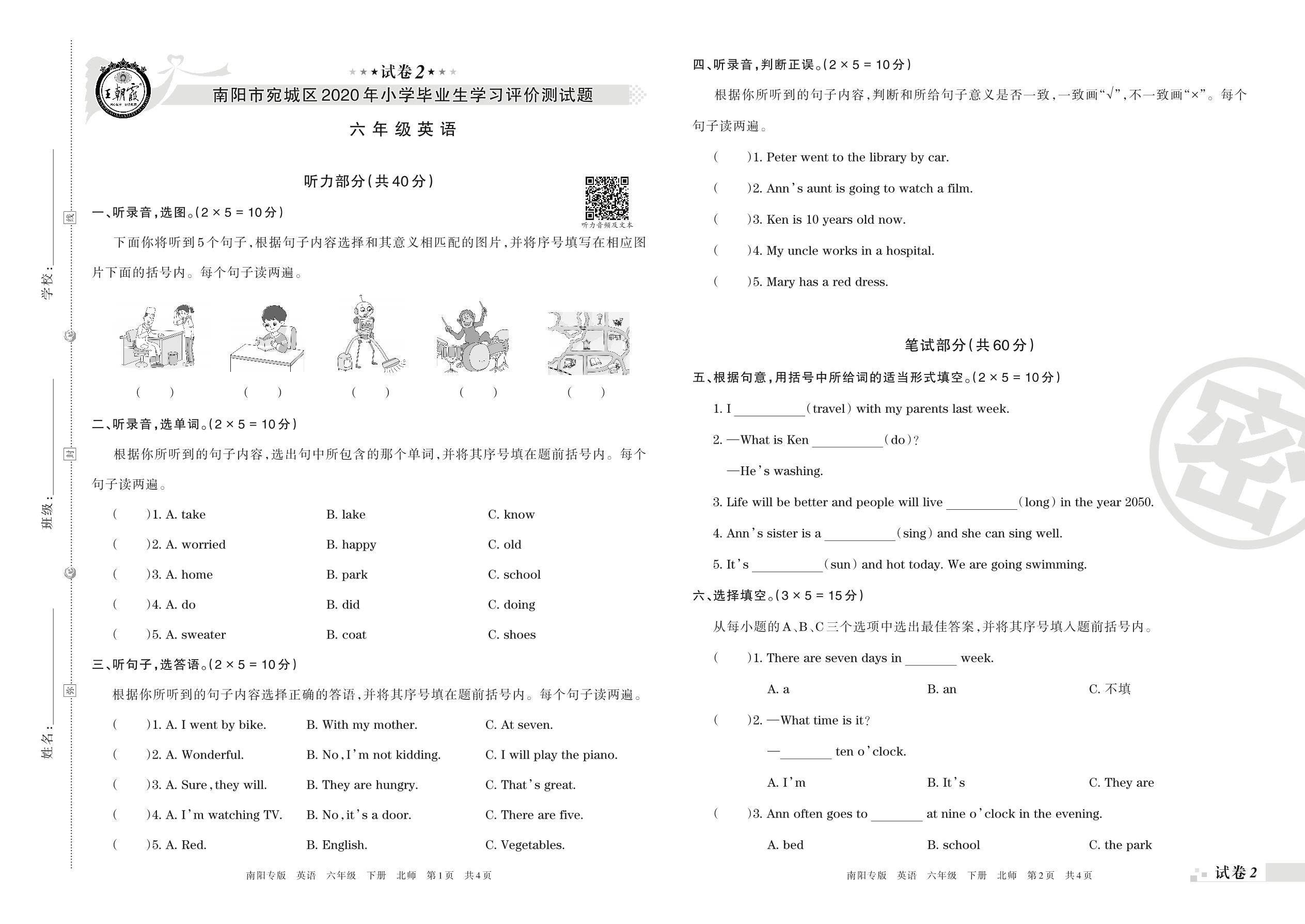 2019-2020学年第二学期南阳市宛城区六年级英语试卷(北师版)【2】