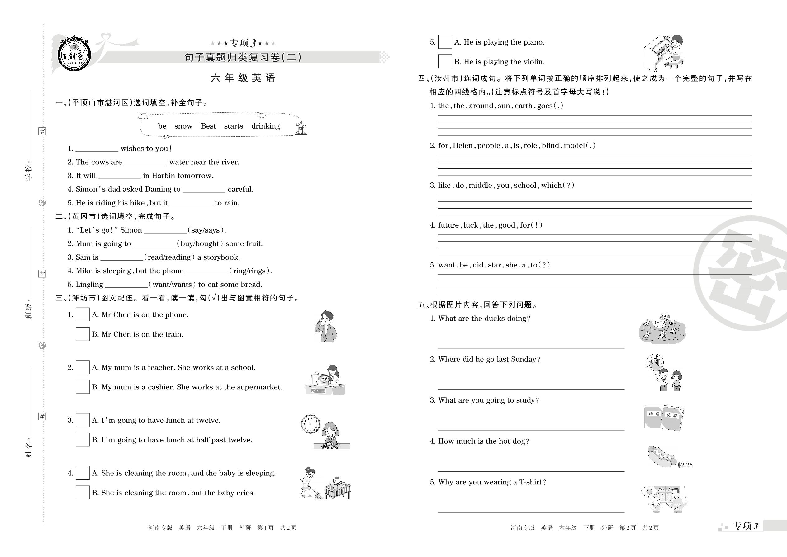 王朝霞期末专项卷——句子、情景交际真题归类复习六年级下册英语(外研版)【0】