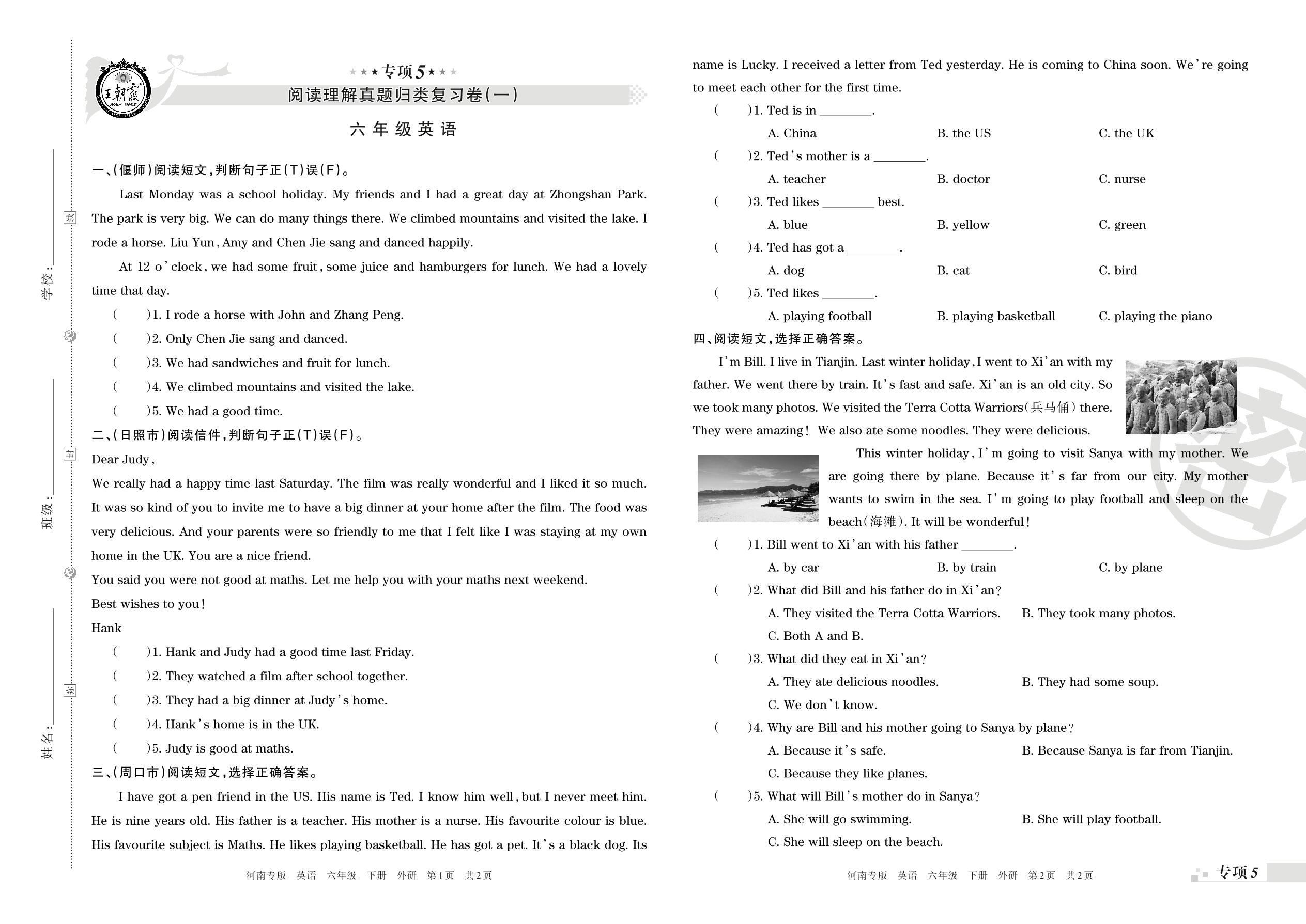王朝霞期末专项卷——阅读理解(一)、(二)真题归类复习六年级下册英语(外研版)【0】
