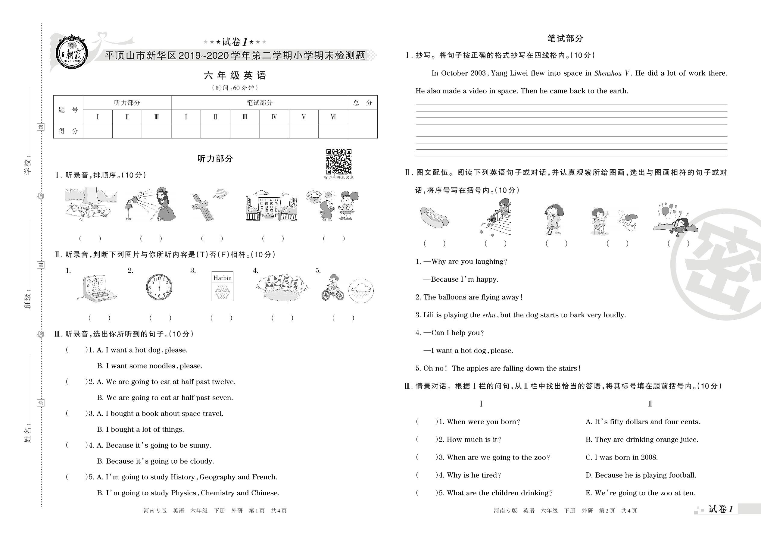 2019-2020学年第二学期平顶山市新华区六年级英语试卷(外研版)【1】