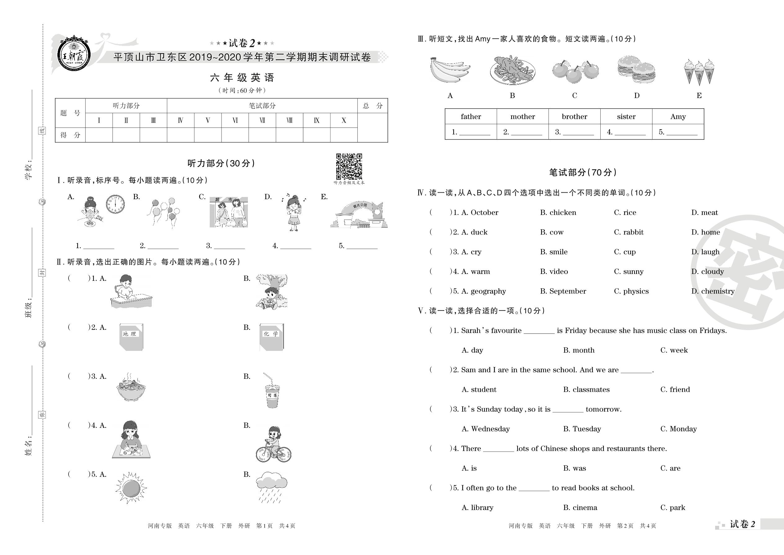 2019-2020学年第二学期平顶山市卫东区六年级英语试卷(外研版)【2】
