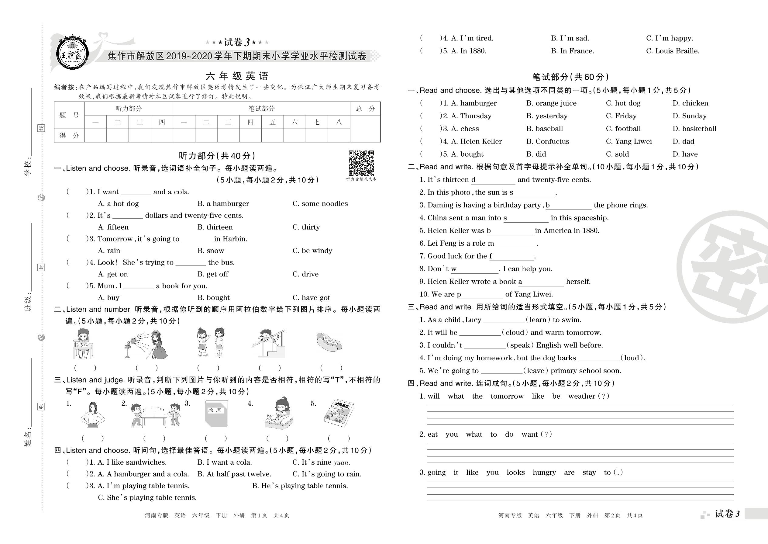 2019-2020学年第二学期焦作市解放区六年级英语试卷(外研版)【3】