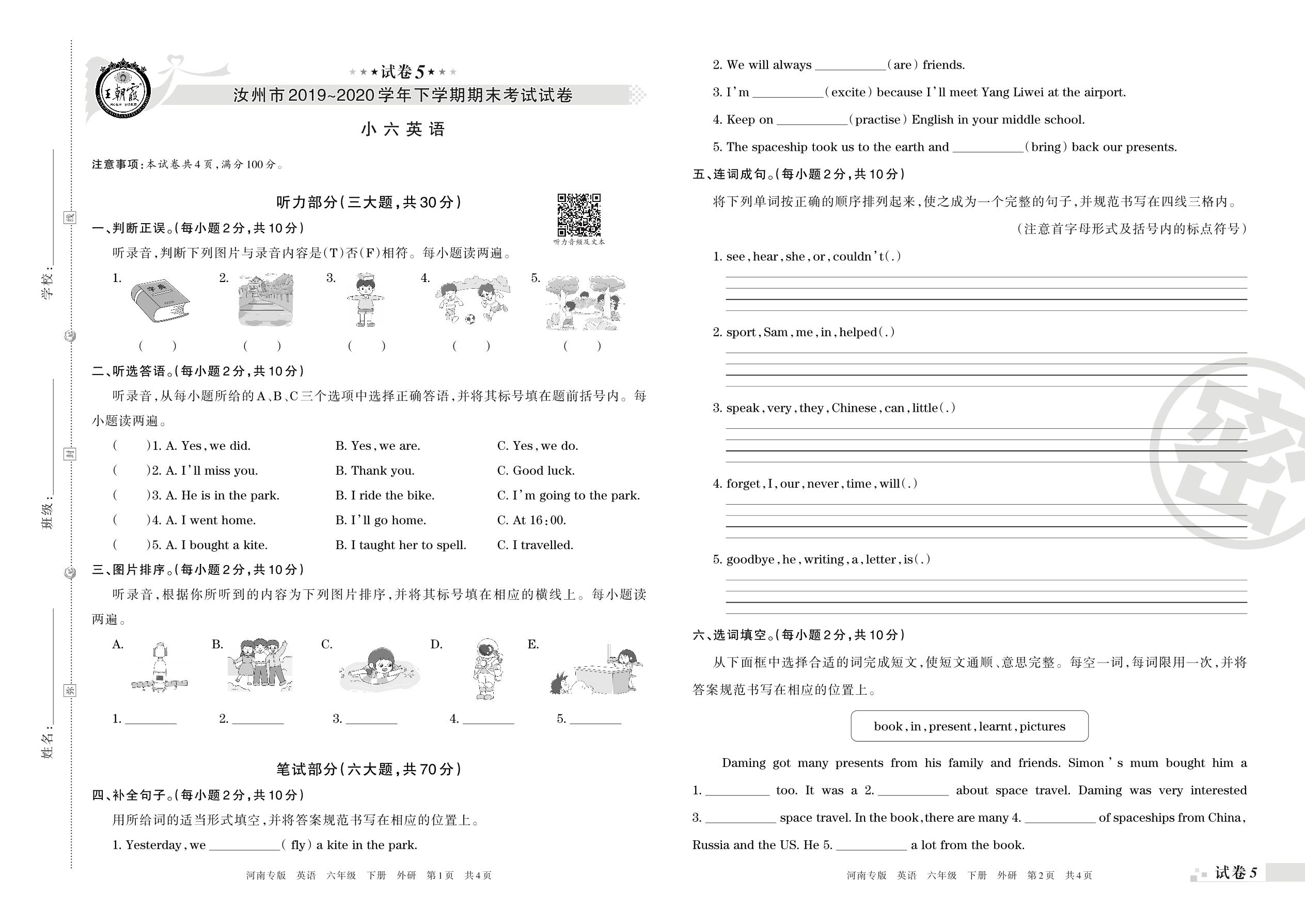 2019-2020学年第二学期汝州市六年级英语试卷(外研版)【5】