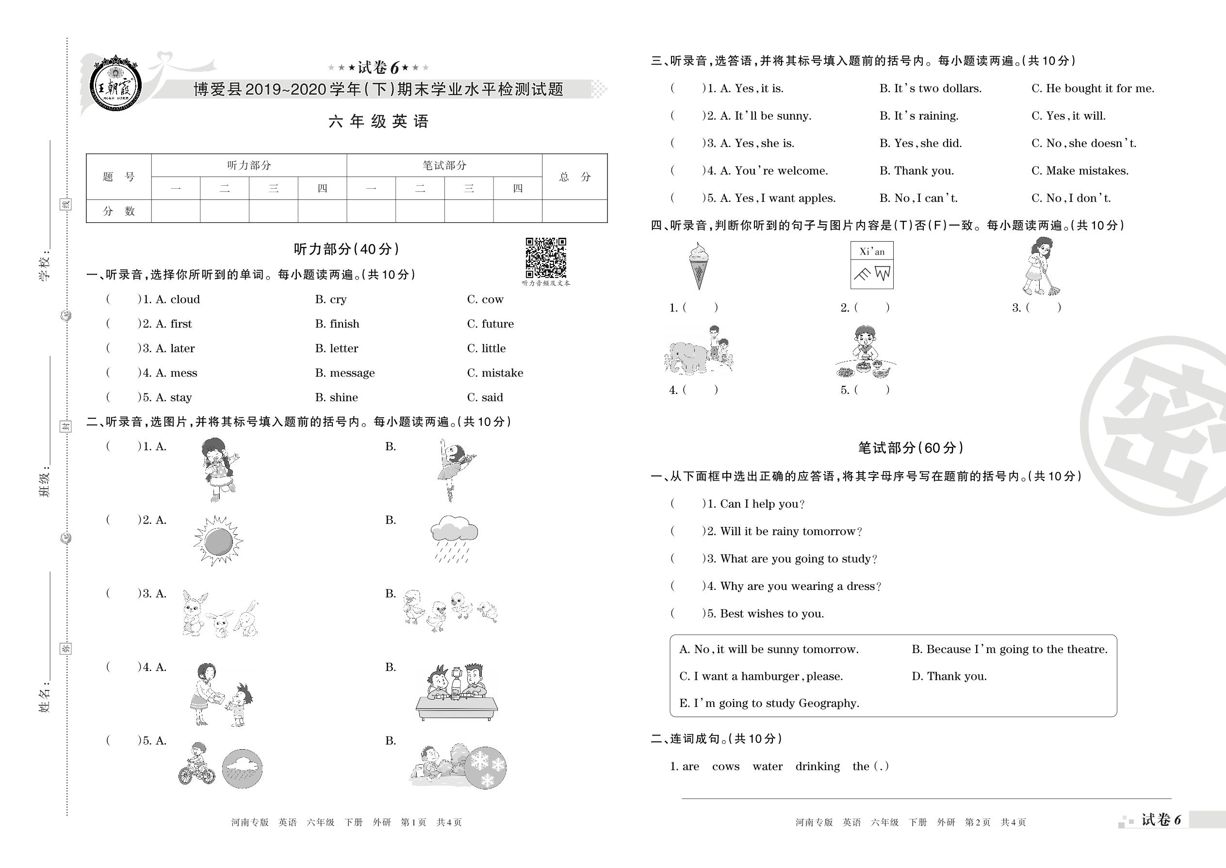2019-2020学年第二学期焦作市博爱县六年级英语试卷(外研版)【6】