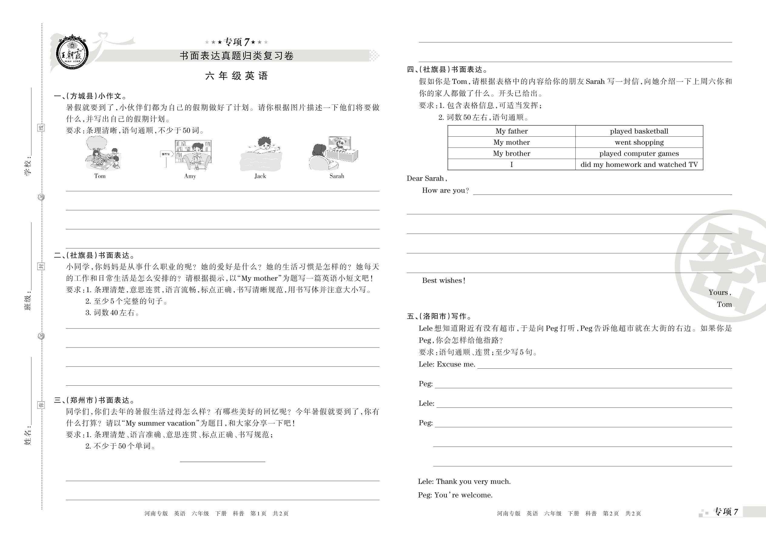 王朝霞期末专项卷——书面表达真题归类复习、补全短文六年级下册英语(科普版)【0】