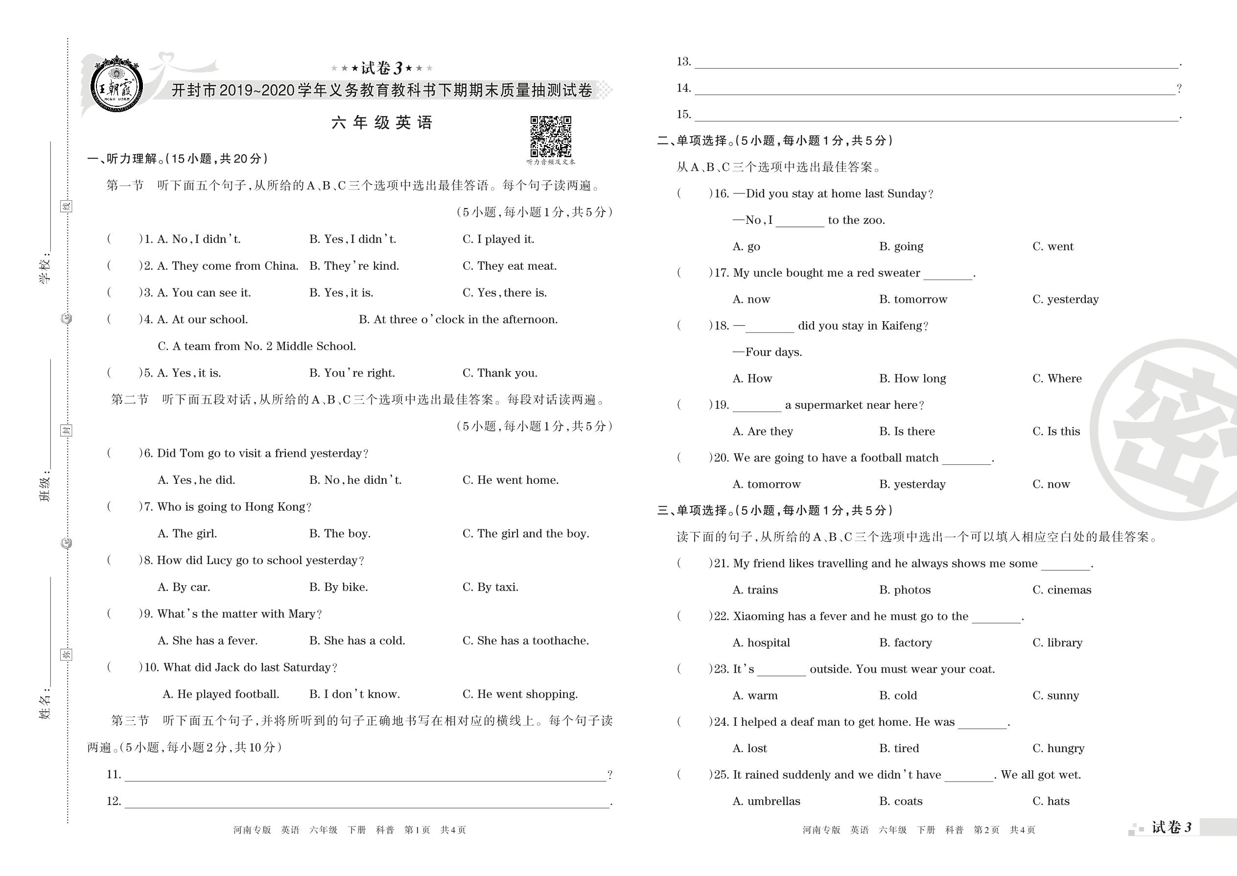 2019-2020学年第二学期开封市六年级英语试卷(科普版)【3】