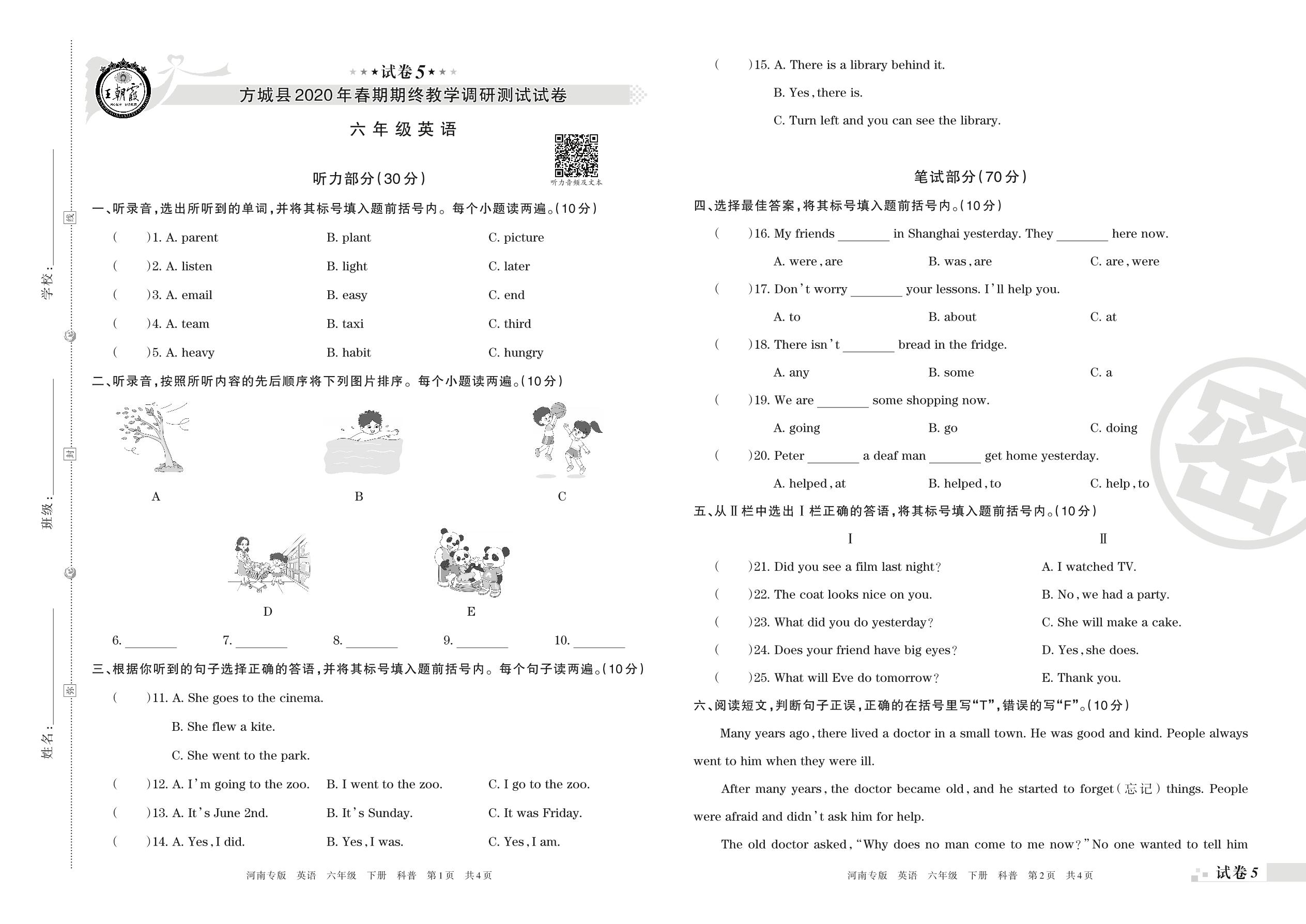 2019-2020学年第二学期南阳市方城县六年级英语试卷(科普版)【5】