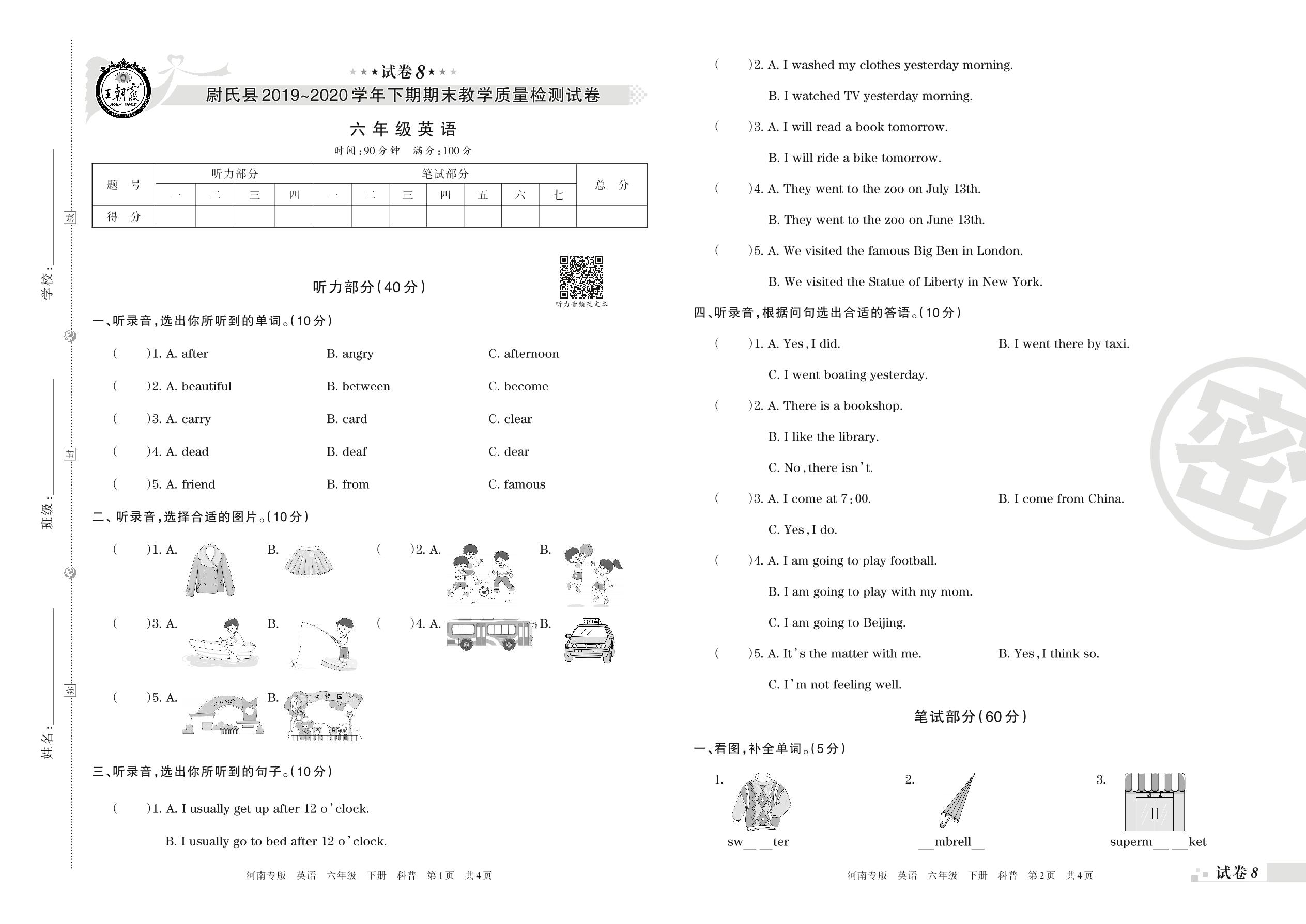 2019-2020学年第二学期开封市尉氏县六年级英语试卷(科普版)【8】