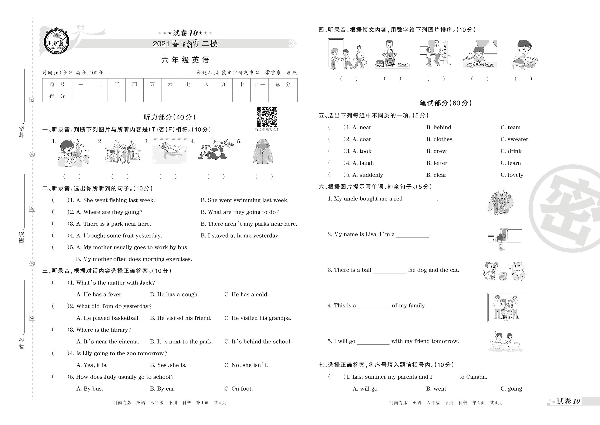 王朝霞期末模拟卷六年级下册英语(科普版)_R210807155424【10】