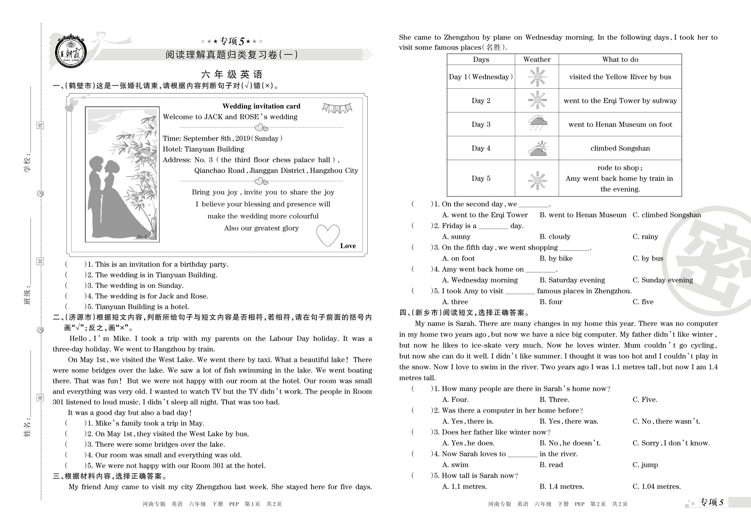 王朝霞期末专项卷——阅读理解(一)、(二)真题归类复习六年级下册英语(PEP版)_R210807155440【0】
