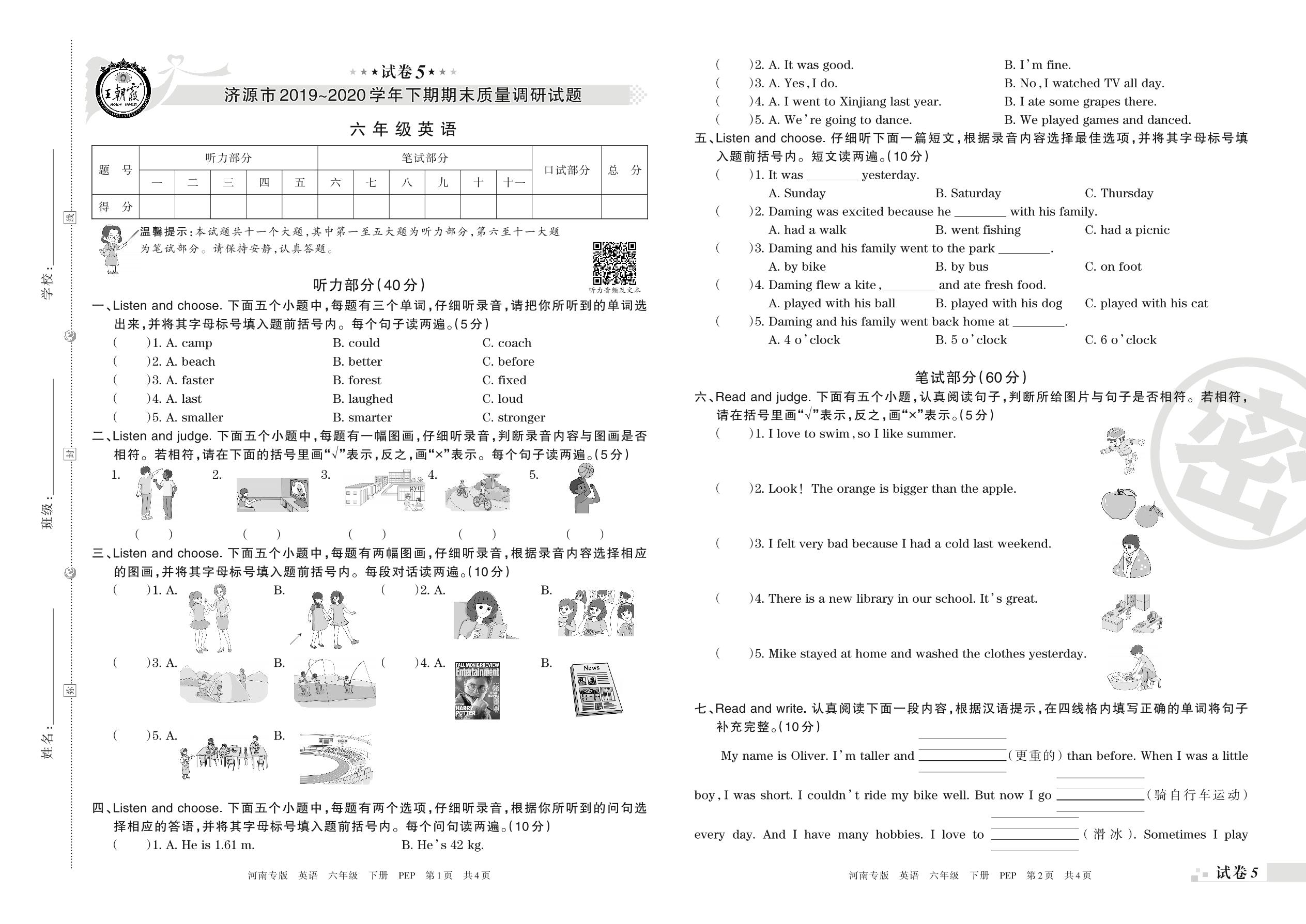 2019-2020学年第二学期济源市六年级英语试卷(PEP版)【5】