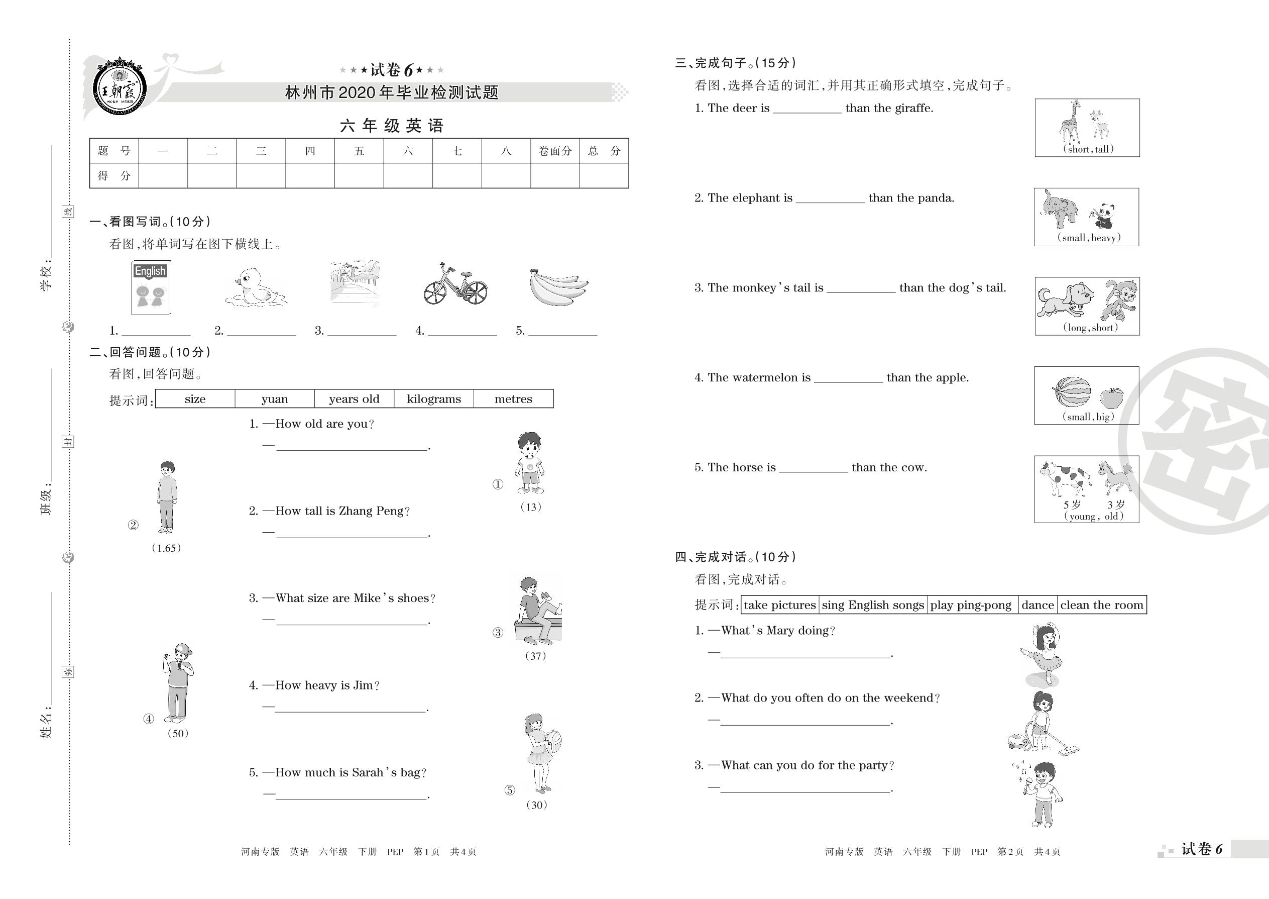 六年级英语人教PEP版(三起始)下册期末卷
