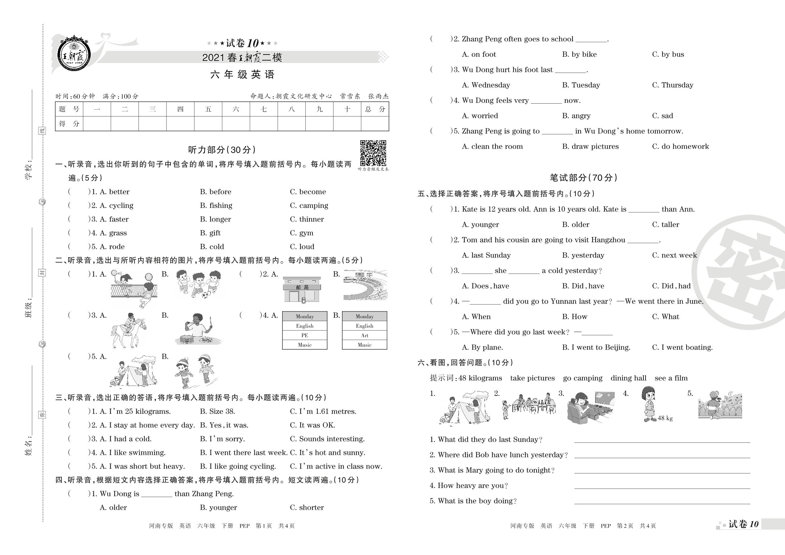 王朝霞期末模拟卷六年级下册英语(PEP版)_R210807155537【10】