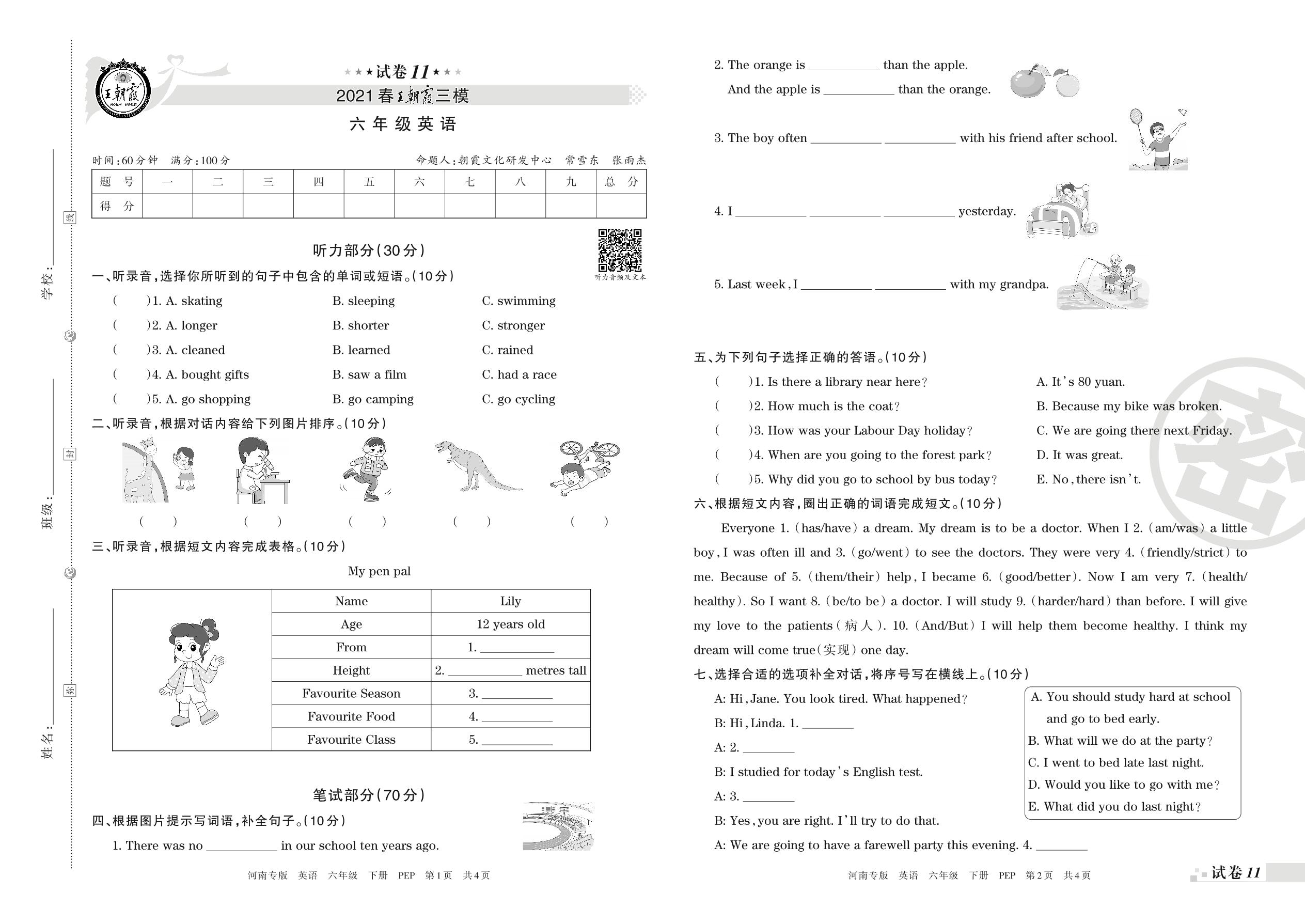 王朝霞期末模拟卷六年级下册英语(PEP版)_R210807155546【11】