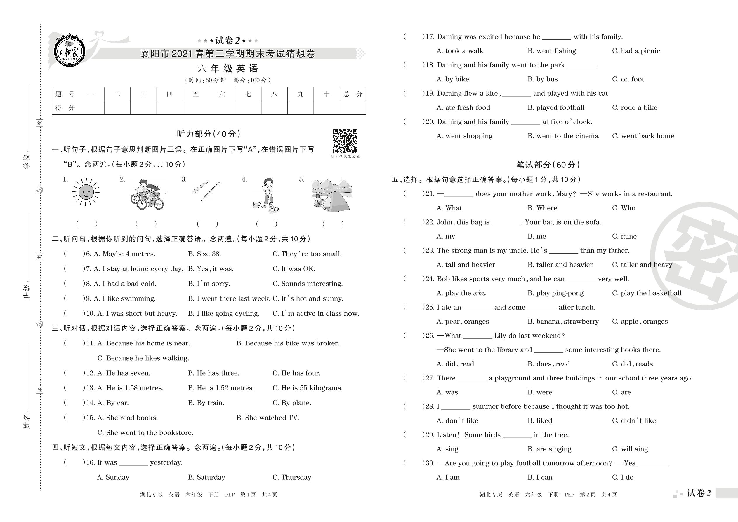 2020-2021学年第二学期襄阳市六年级英语试卷(PEP版)【2】