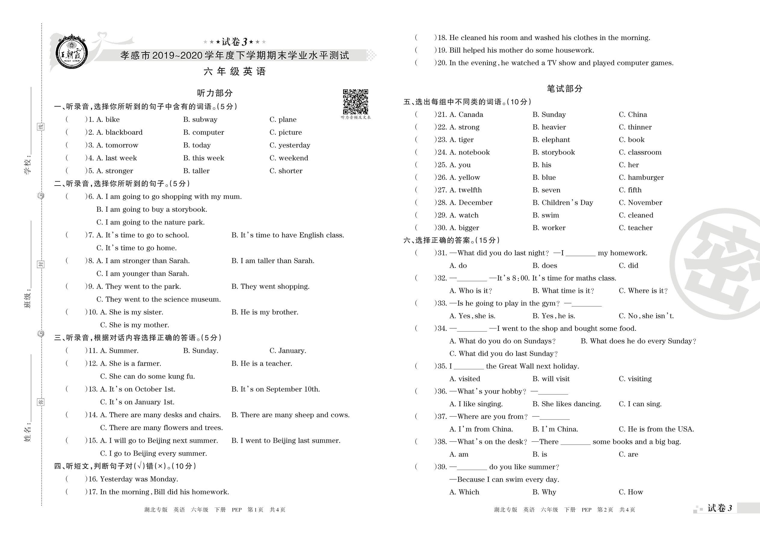 2019-2020学年第二学期孝感市六年级英语试卷(PEP版)【3】