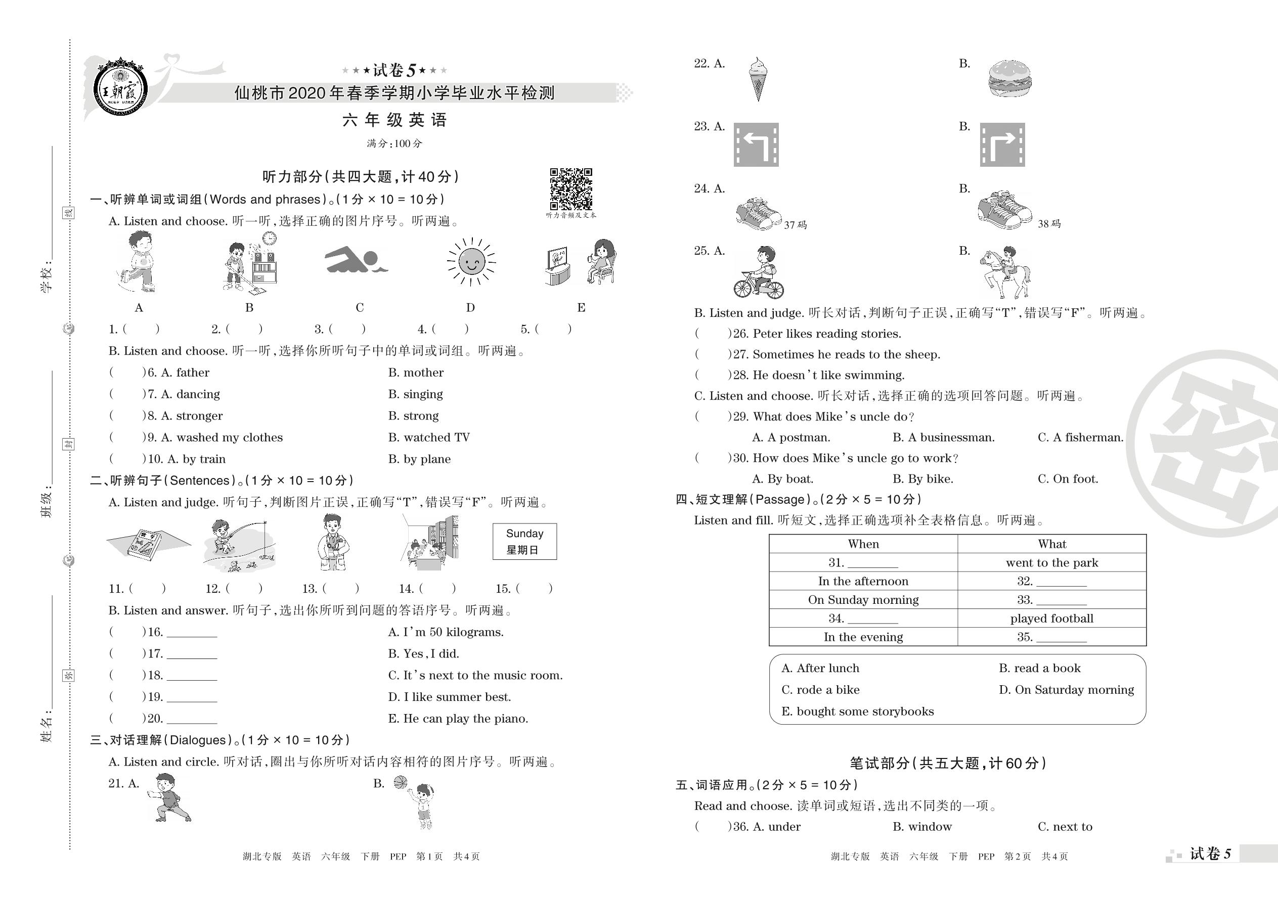2019-2020学年第二学期仙桃市六年级英语试卷(PEP版)【5】