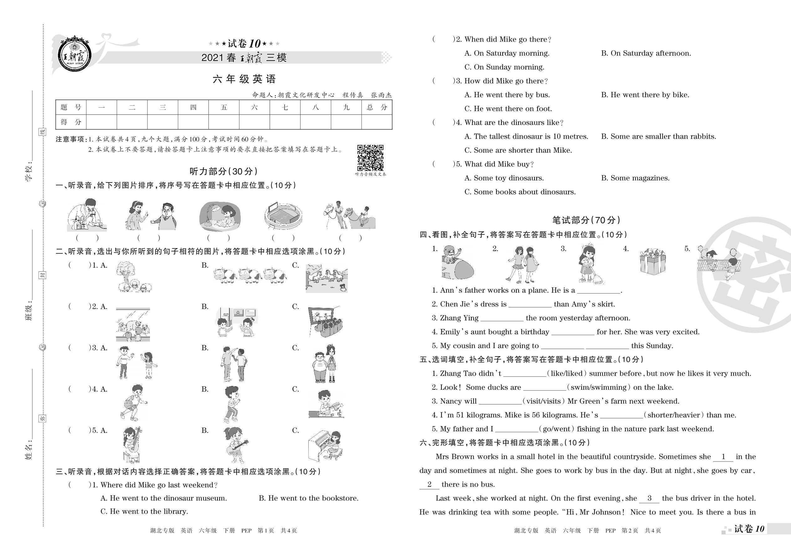 王朝霞期末模拟卷六年级下册英语(PEP版)_R210807155701【10】