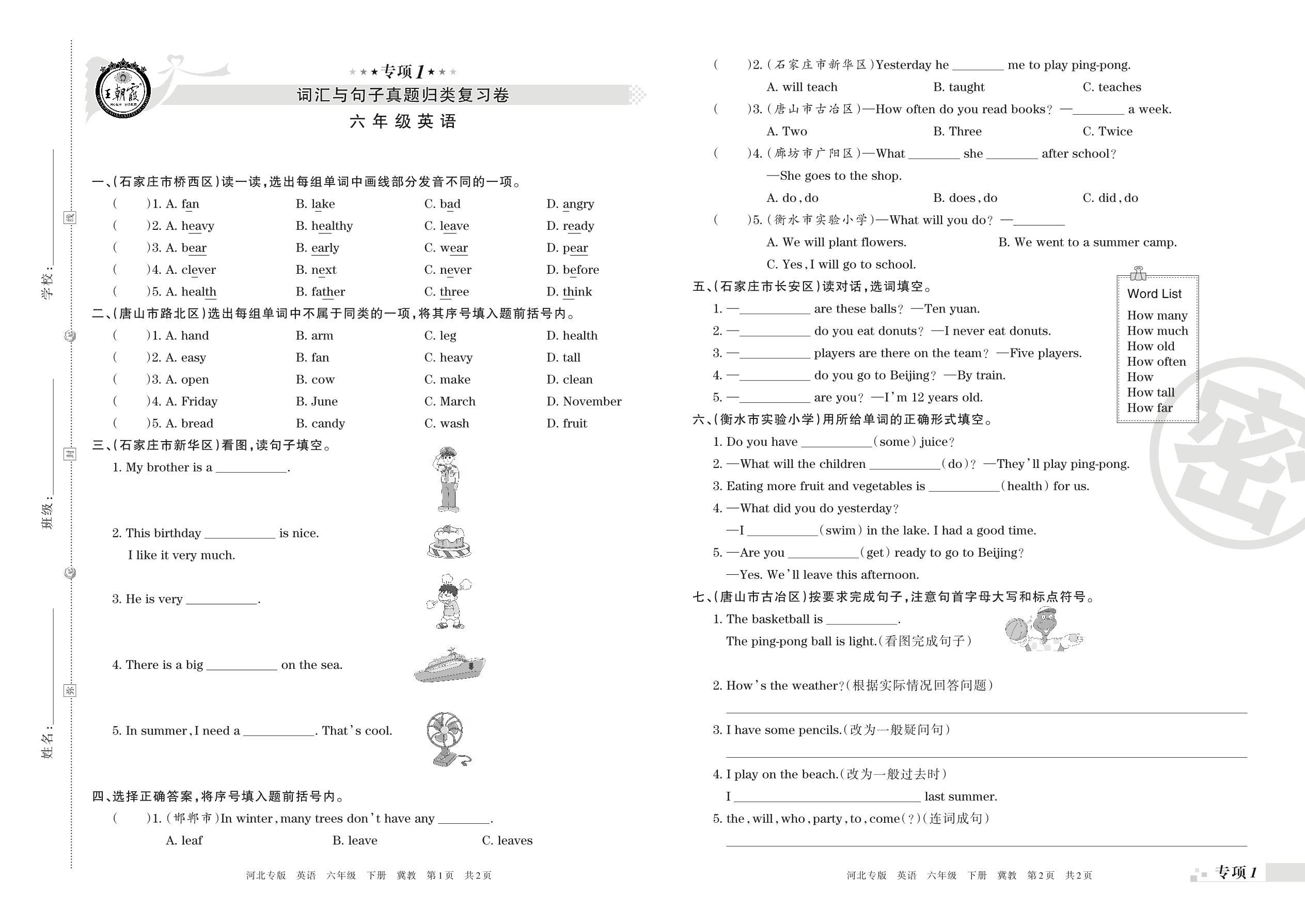 王朝霞期末专项卷——词汇与句子、补全短文与阅读理解真题归类复习六年级下册英语(冀教版)【0】