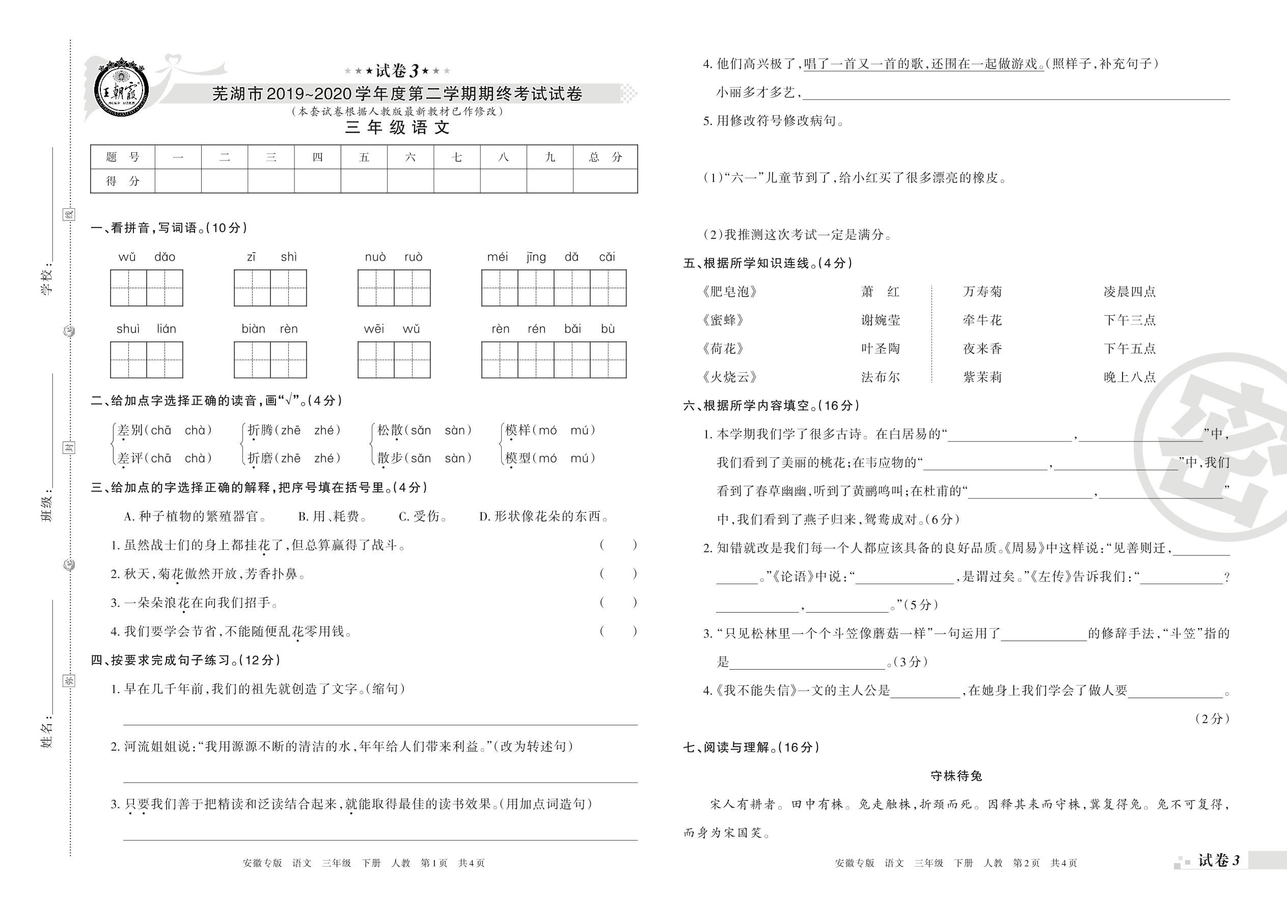 2019-2020学年第二学期芜湖市三年级语文试卷(人教版)【3】