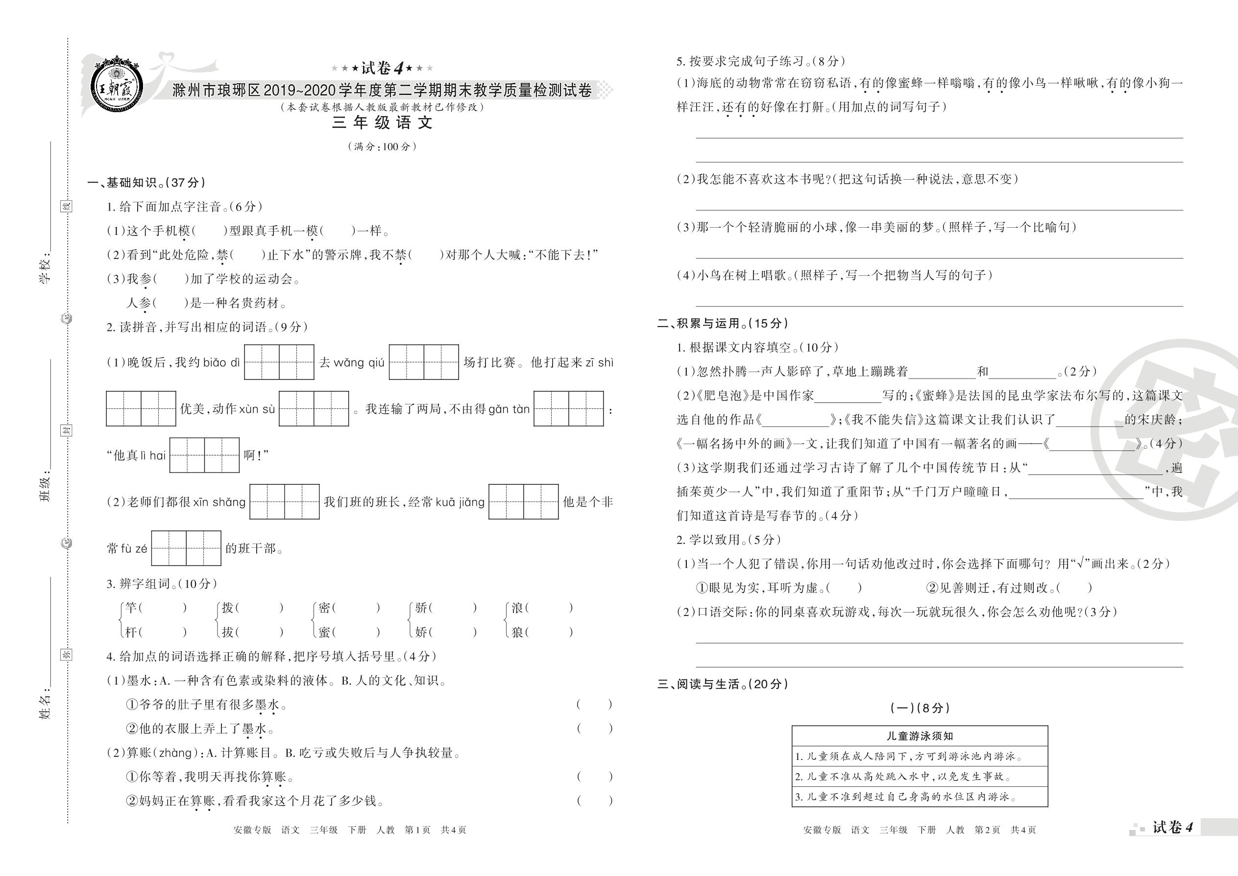 2019-2020学年第二学期滁州市琅琊区三年级语文试卷(人教版)【4】