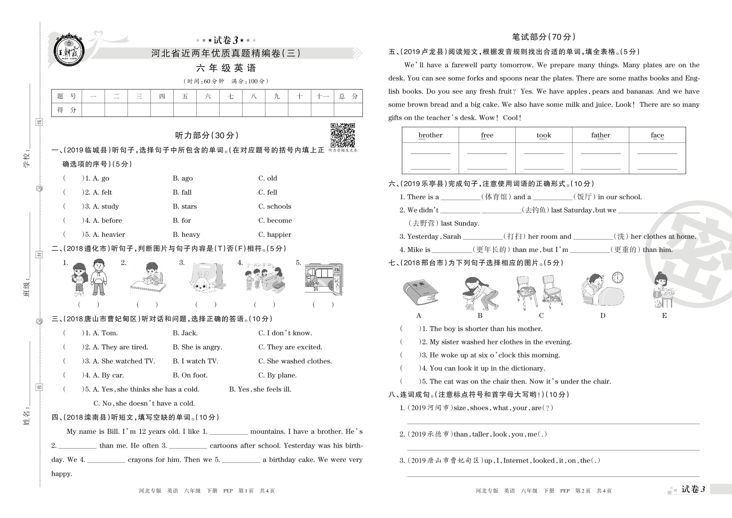 河北省近两年优质真题精编卷(三)六年级下册英语(PEP版)【3】