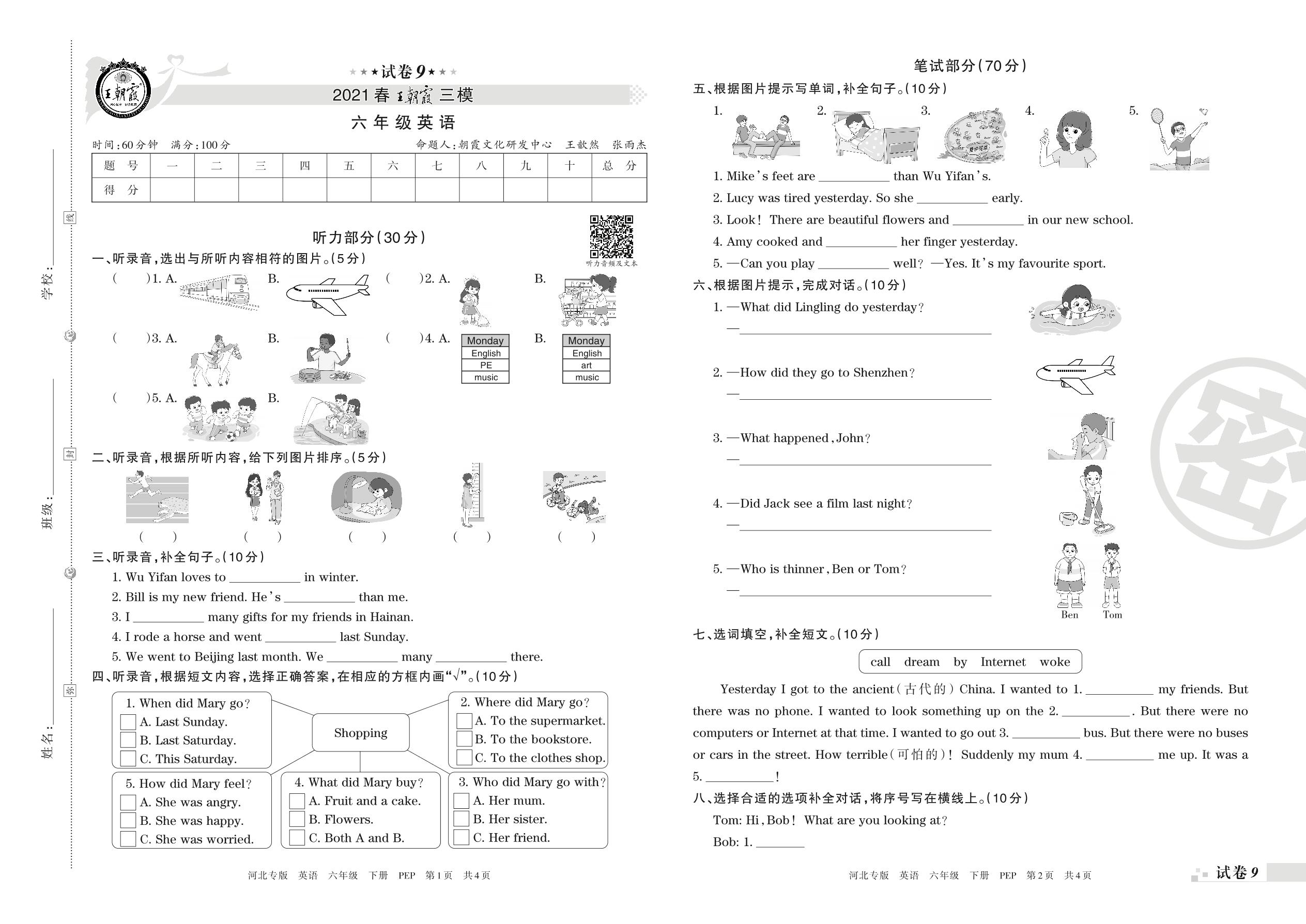 王朝霞期末模拟卷六年级下册英语(PEP版)_R210807160005【9】