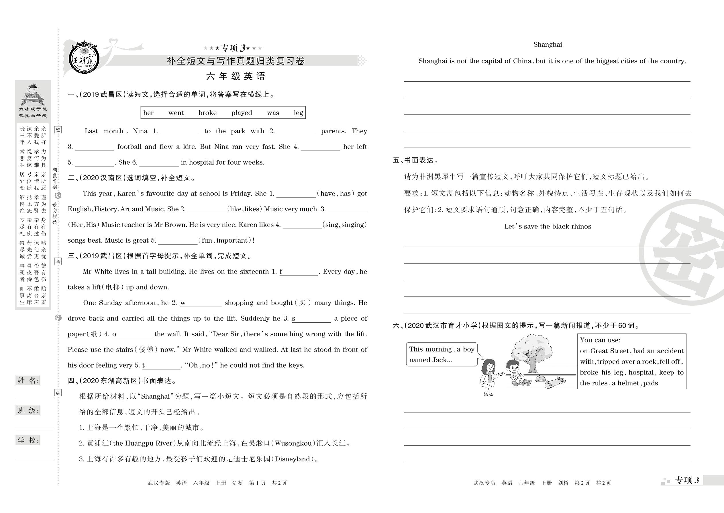 王朝霞期末专项卷——补全短文与写作、绘本阅读六年级上册英语(剑桥版)【0】