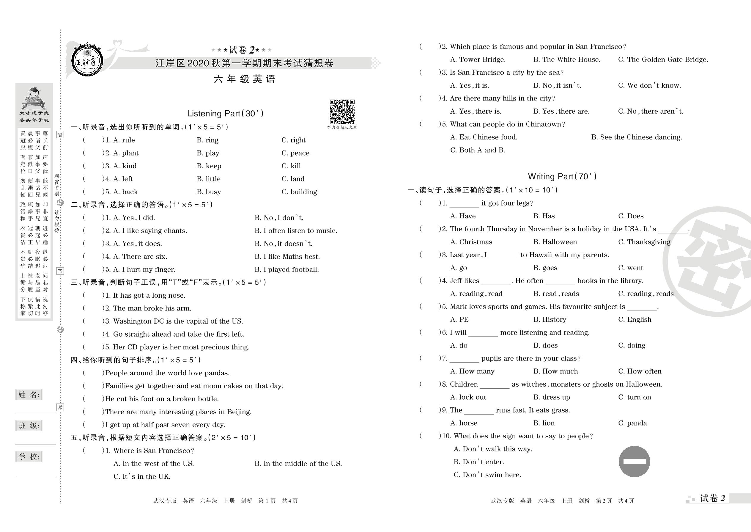 2019-2020学年第一学期武汉市江岸区六年级英语试卷(剑桥版)【2】
