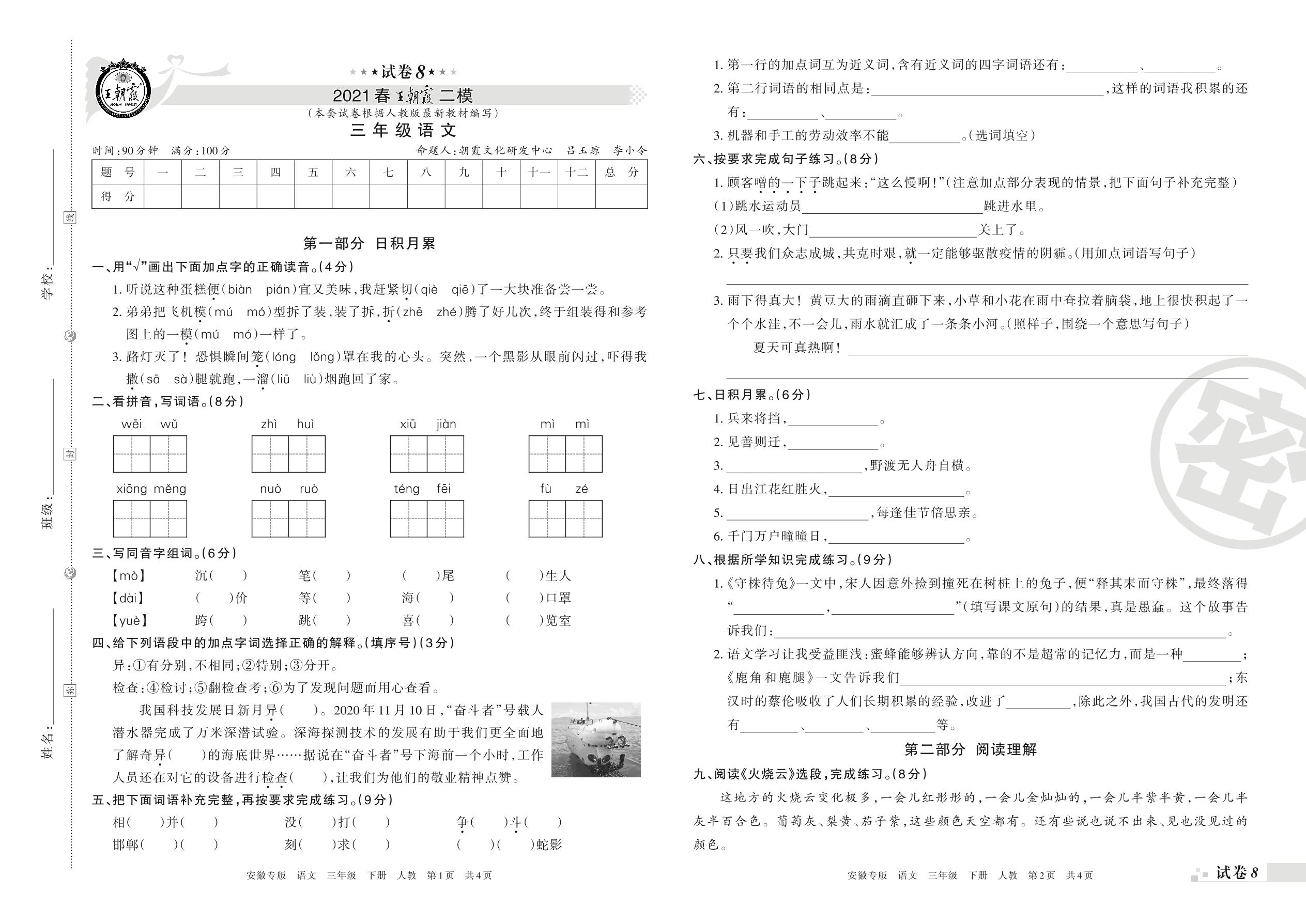 王朝霞期末模拟卷三年级下册语文(人教版)_R21080183715【8】