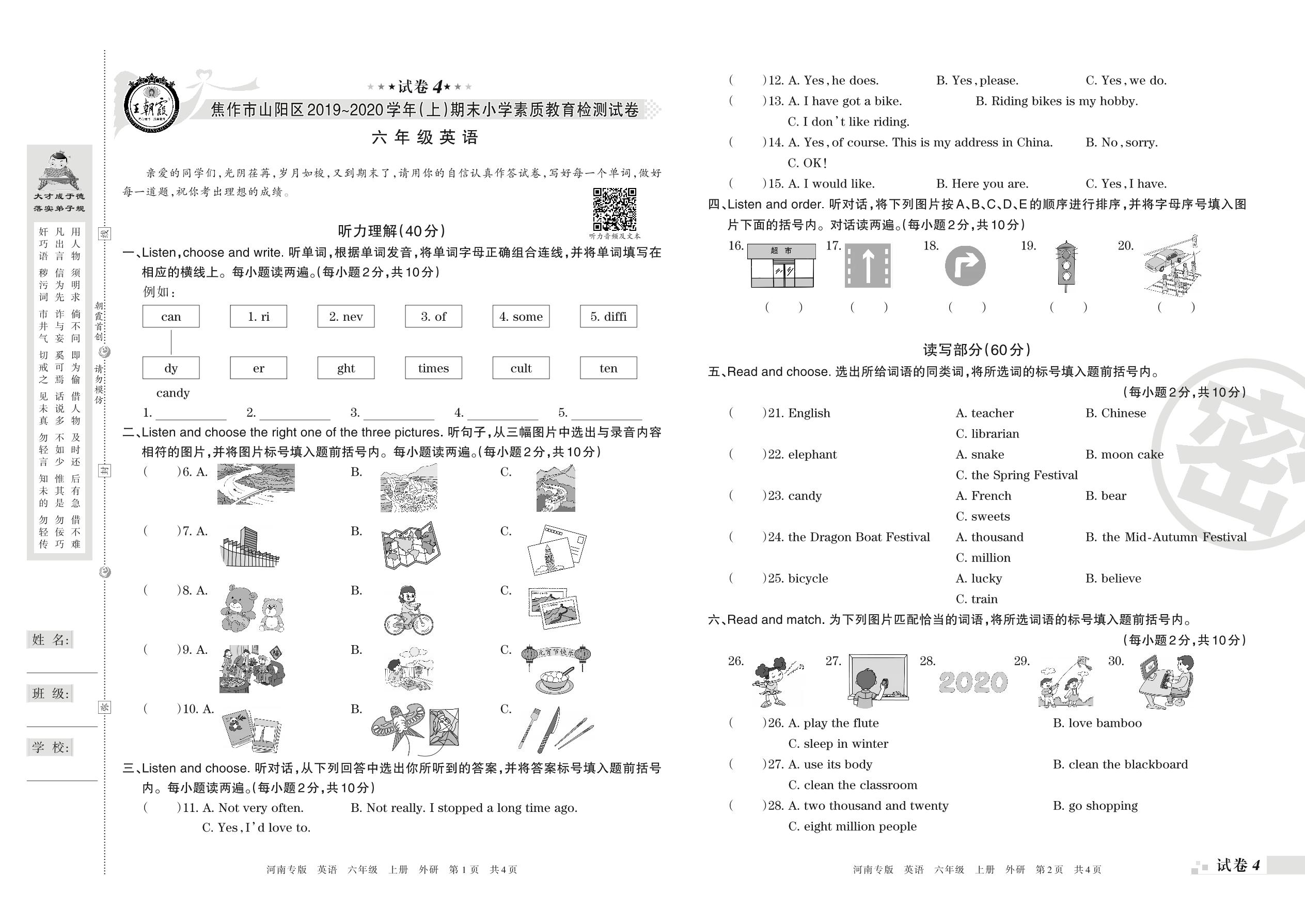2019-2020学年第一学期焦作市山阳区六年级英语试卷(外研版)【4】