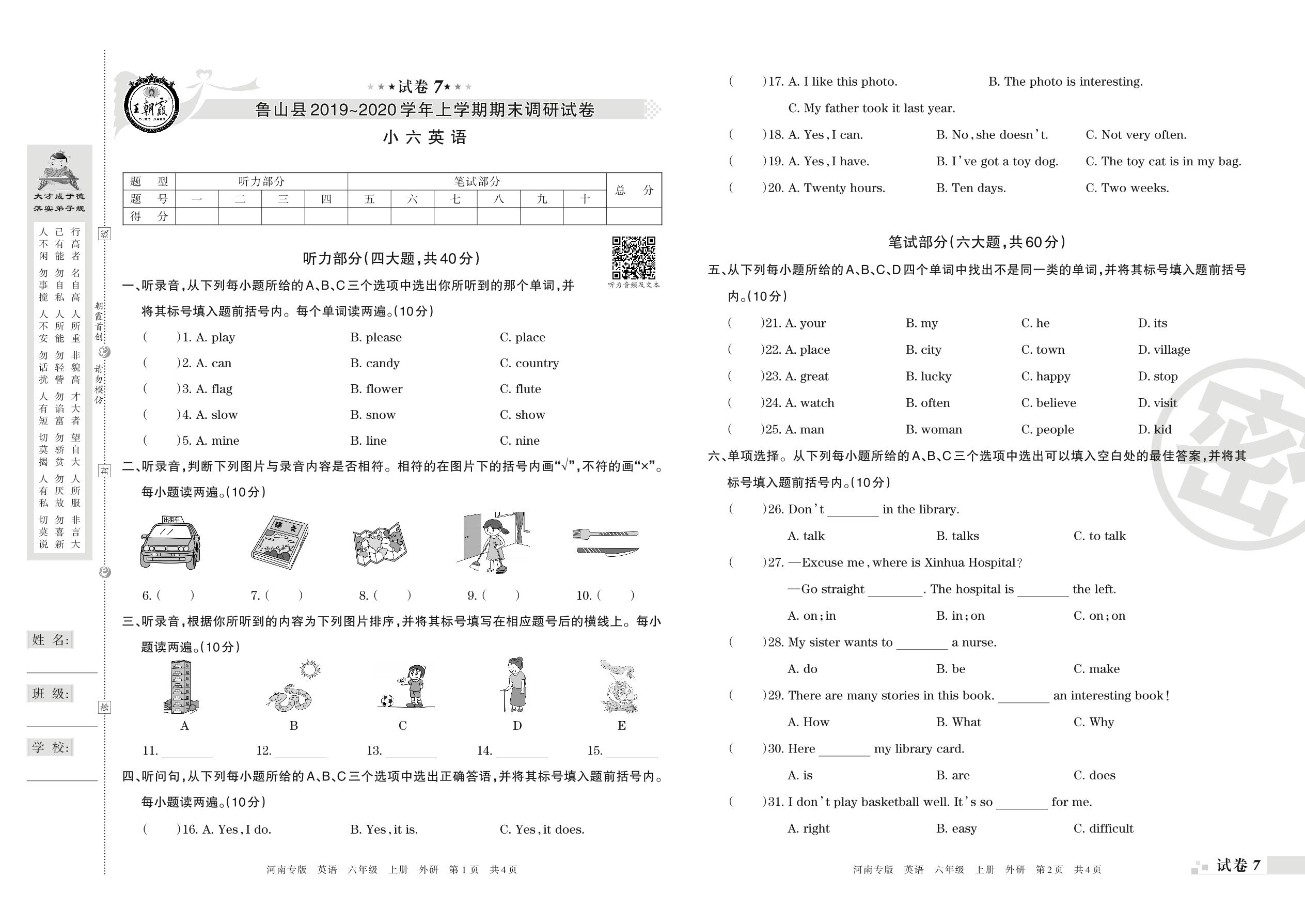 2019-2020学年第一学期平顶山市鲁山县六年级英语试卷(外研版)【7】