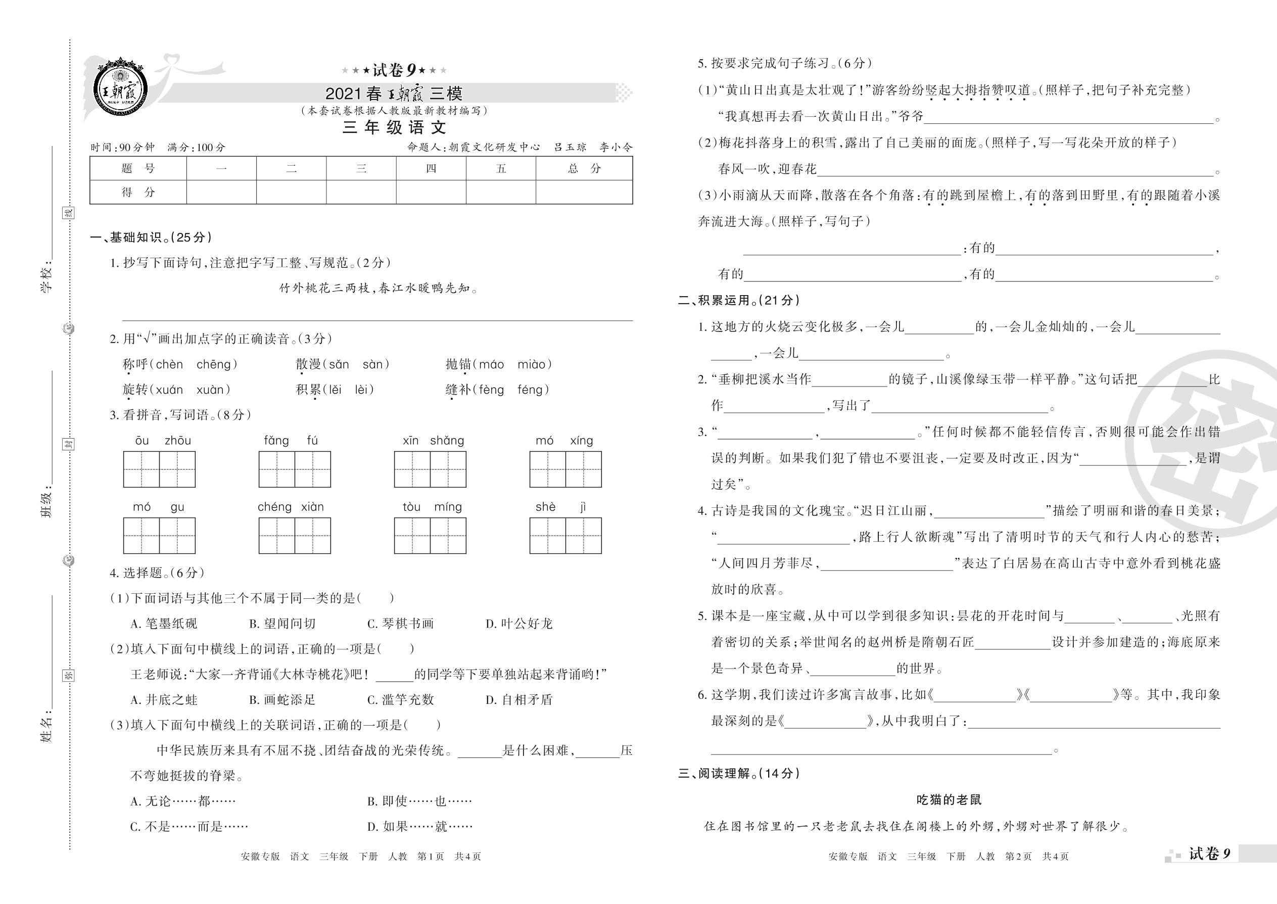 王朝霞期末模拟卷三年级下册语文(人教版)_R21080183720【9】
