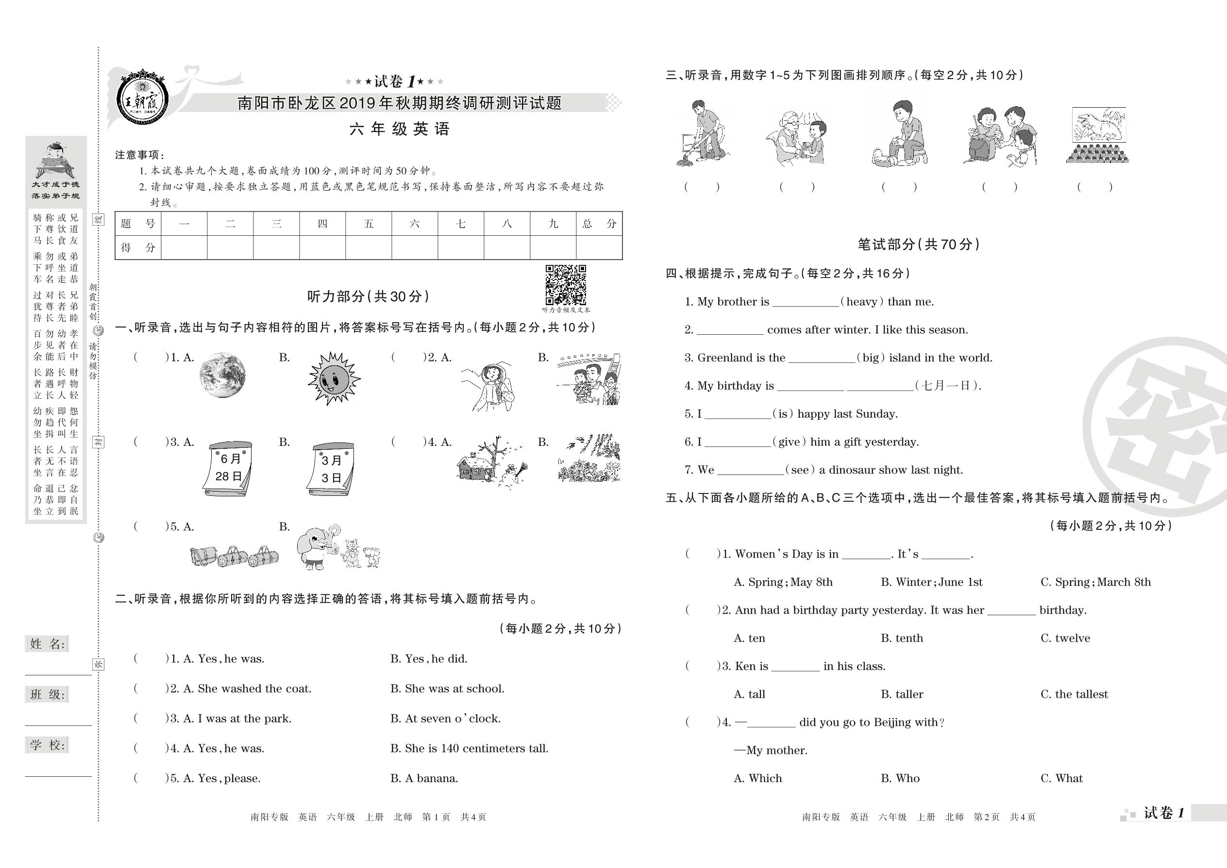 2019-2020学年第一学期南阳市卧龙区六年级英语试卷(北师版)【1】