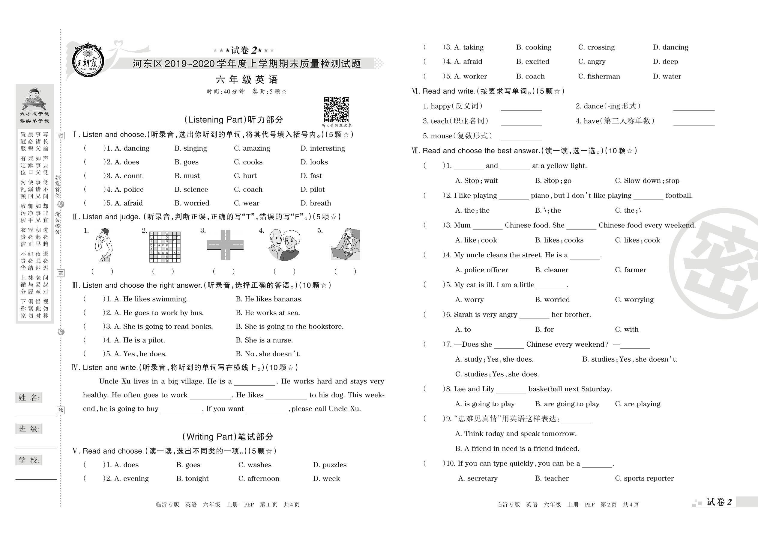 2019-2020学年第一学期临沂市河东区六年级英语试卷(PEP版)【2】
