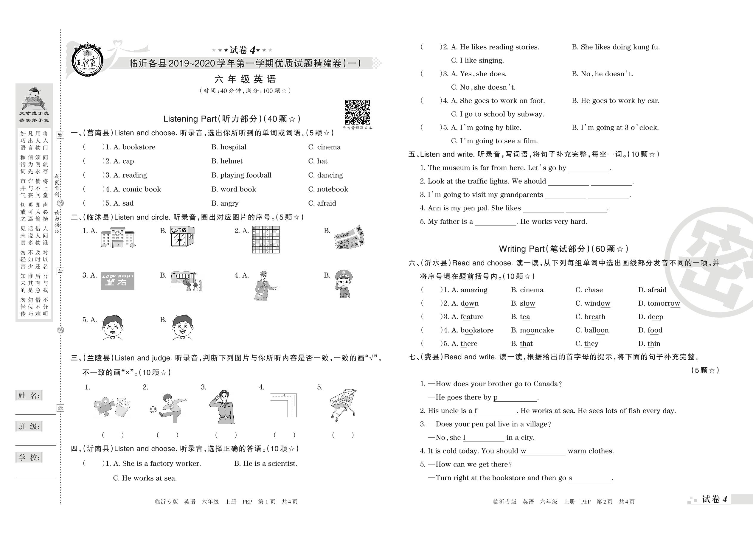 2019-2020学年第一学期临沂市各县优质试题精编卷(一)六年级英语试卷(PEP版)【4】
