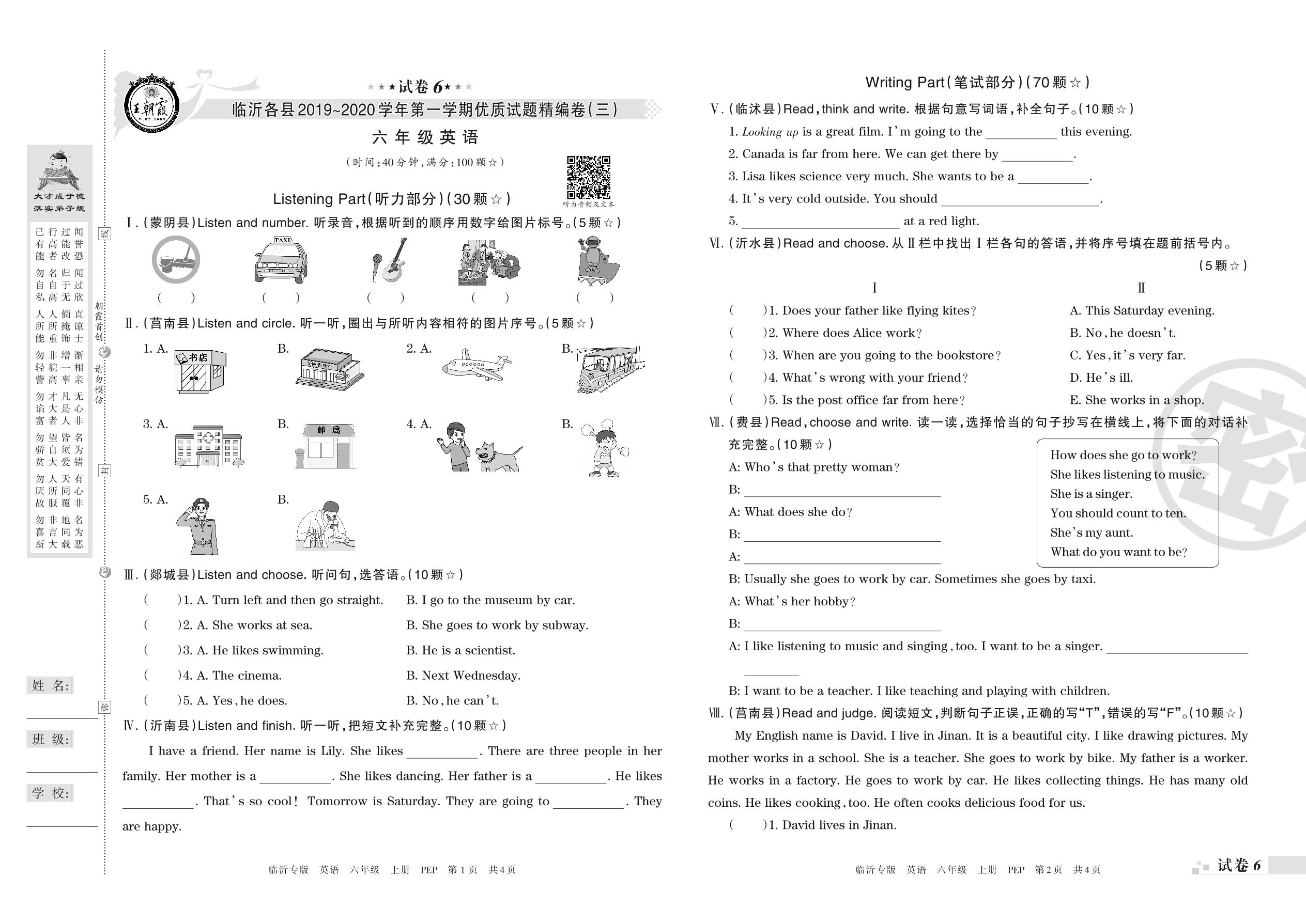 2019-2020学年第一学期临沂市各县优质试题精编卷(三)六年级英语试卷(PEP版)【6】