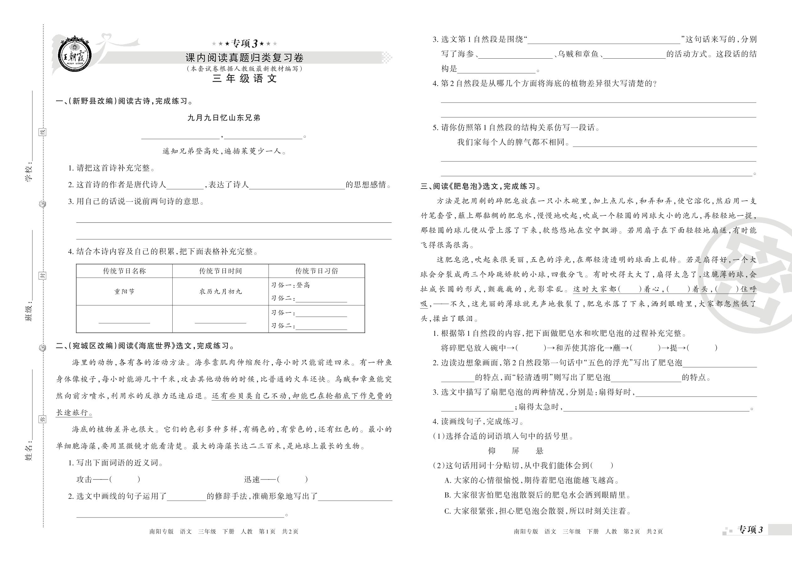 王朝霞期末专项卷——课内阅读、课外阅读真题归类复习三年级下册语文(人教版)【0】