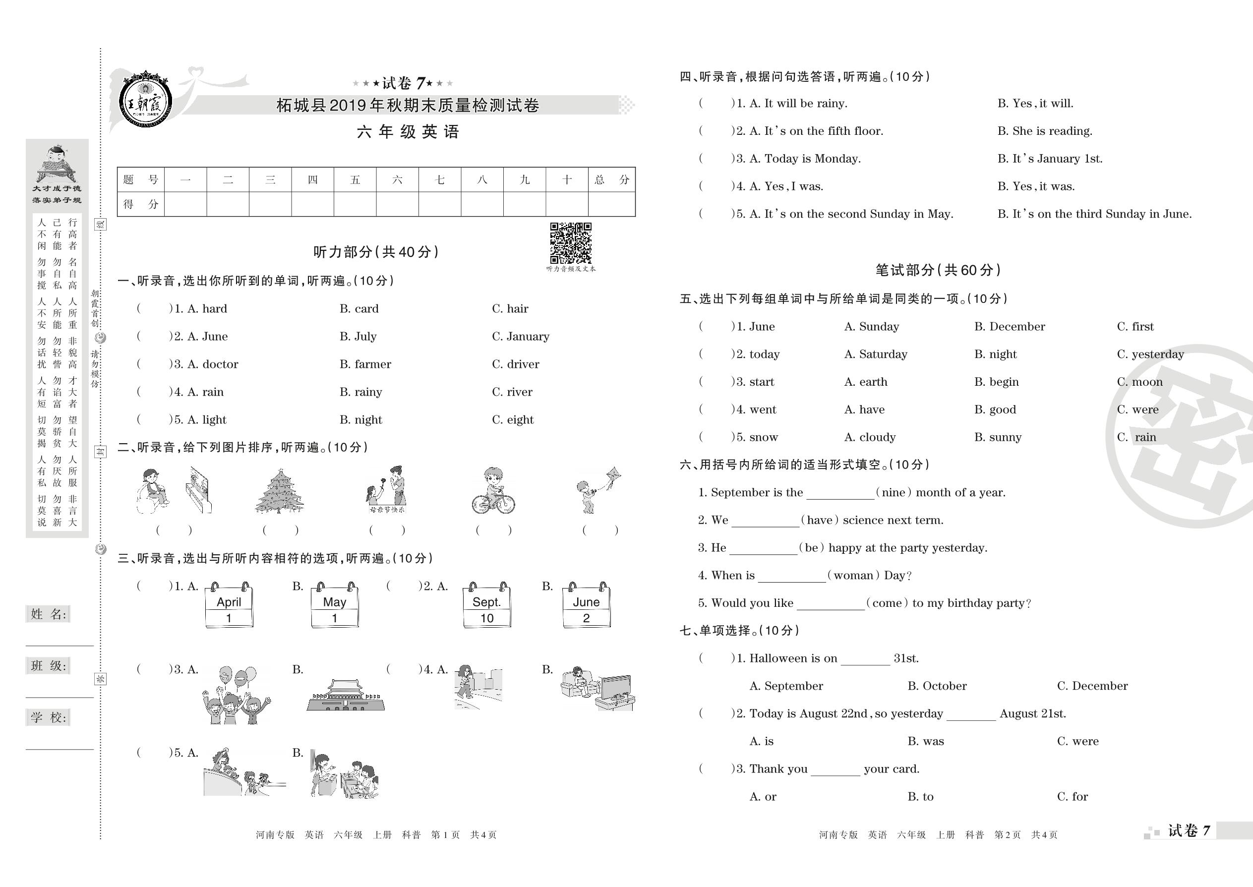 2019-2020学年第一学期商丘市柘城县六年级英语试卷(科普版)【7】