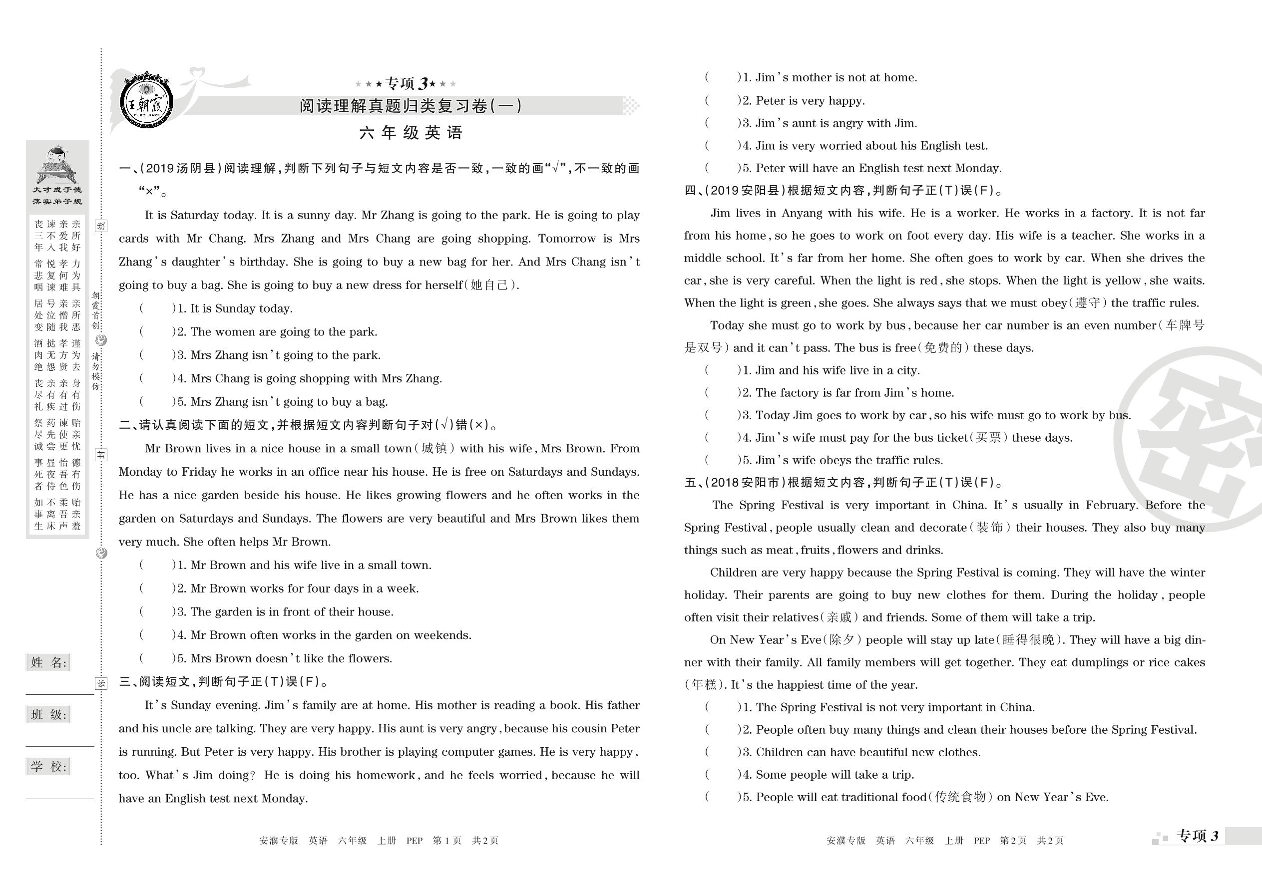 王朝霞期末专项卷——阅读理解真题归类复习六年级上册英语(PEP版)