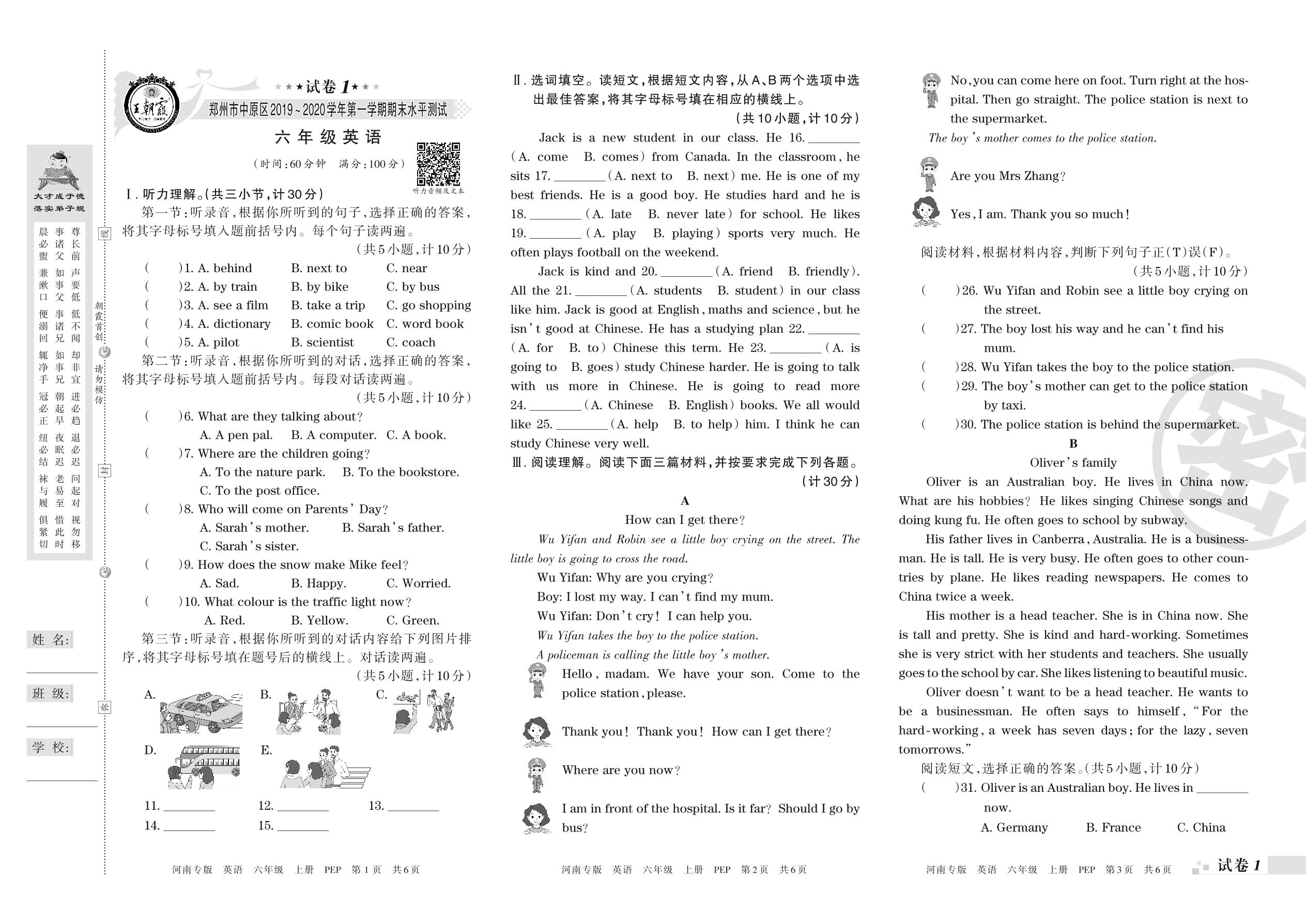 2019-2020学年第一学期郑州市中原区六年级英语试卷(PEP版)【1】
