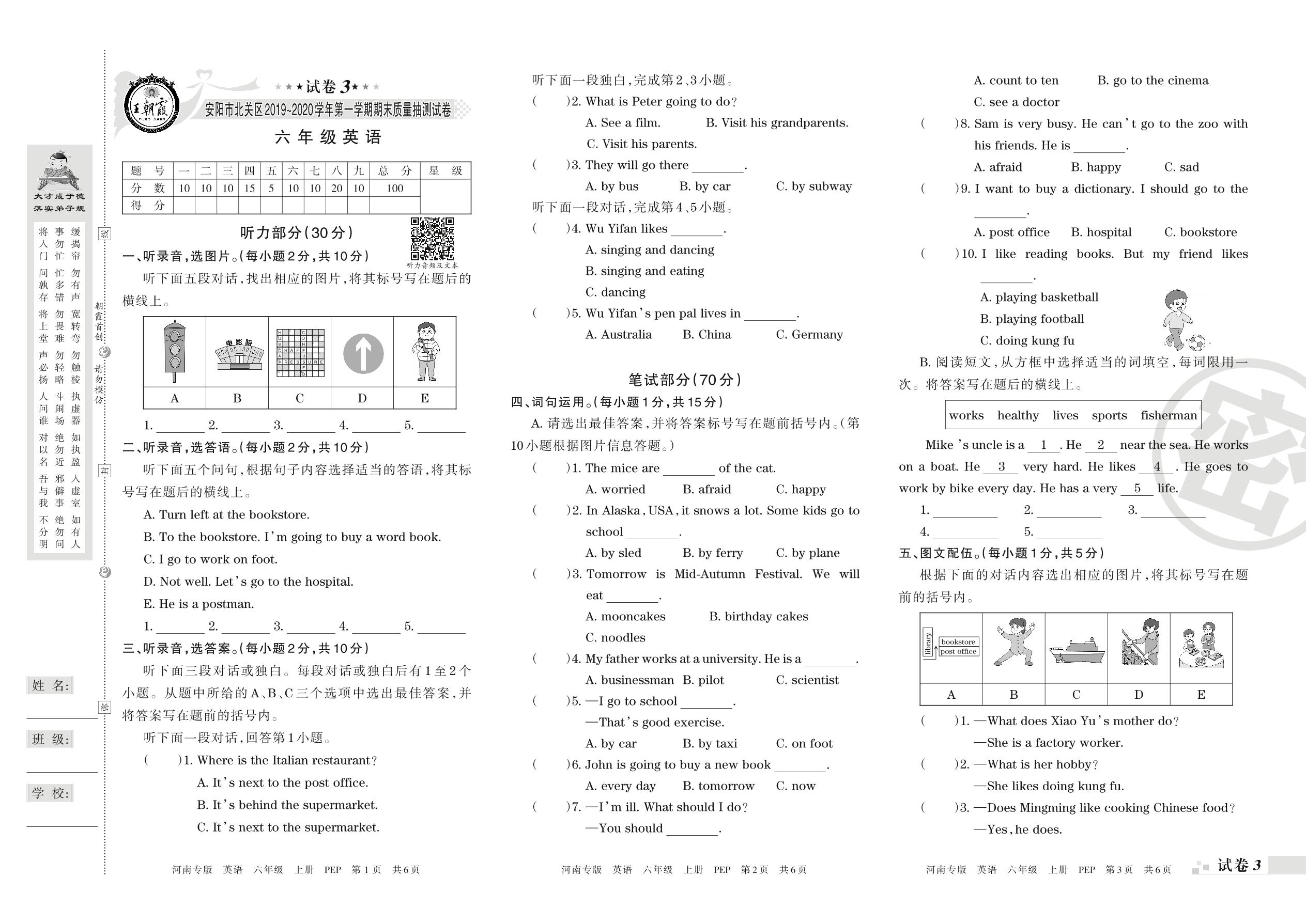 2019-2020学年第一学期安阳市北关区六年级英语试卷(PEP版)【3】