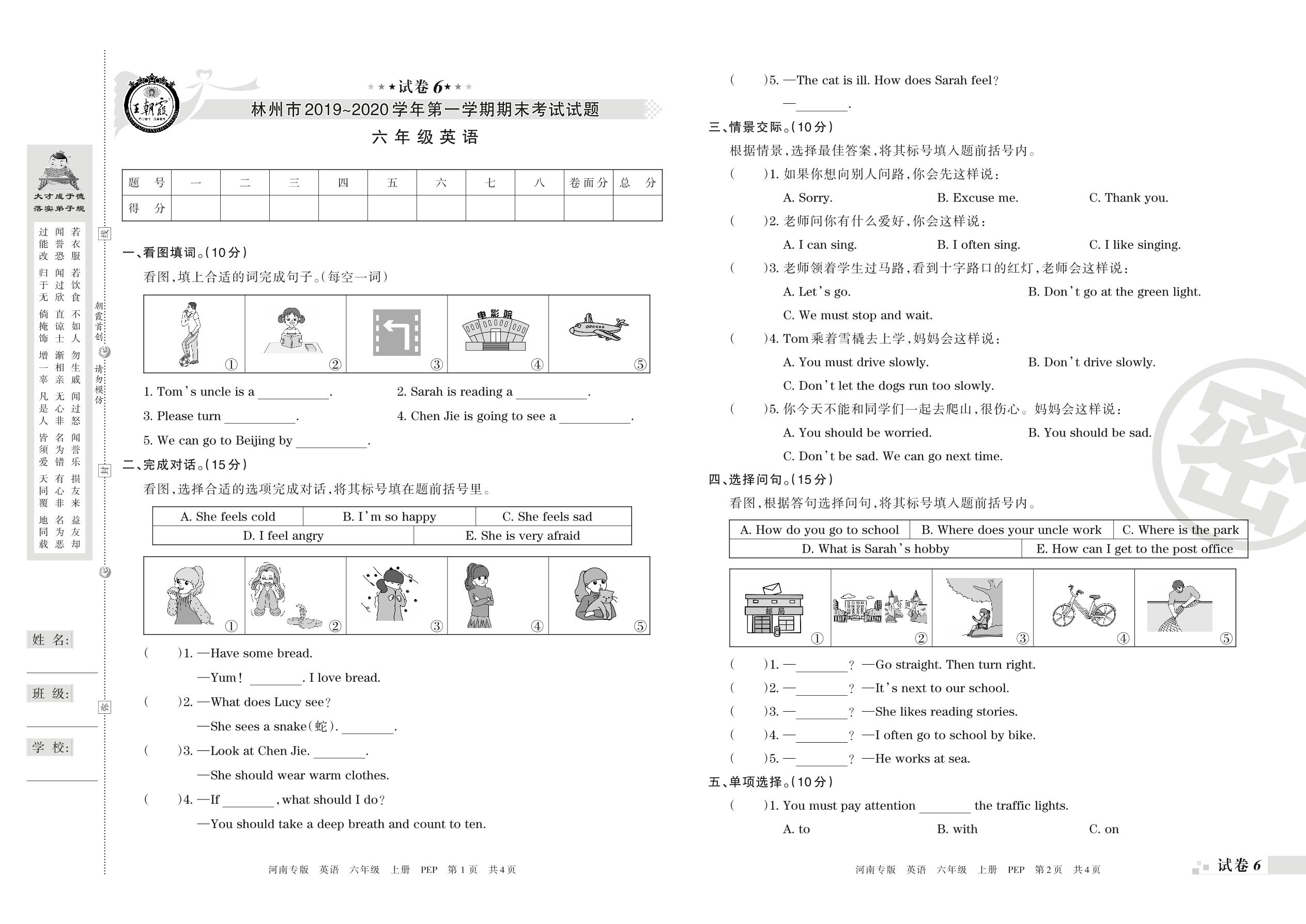 2019-2020学年第一学期林州市六年级英语试卷(PEP版)【6】