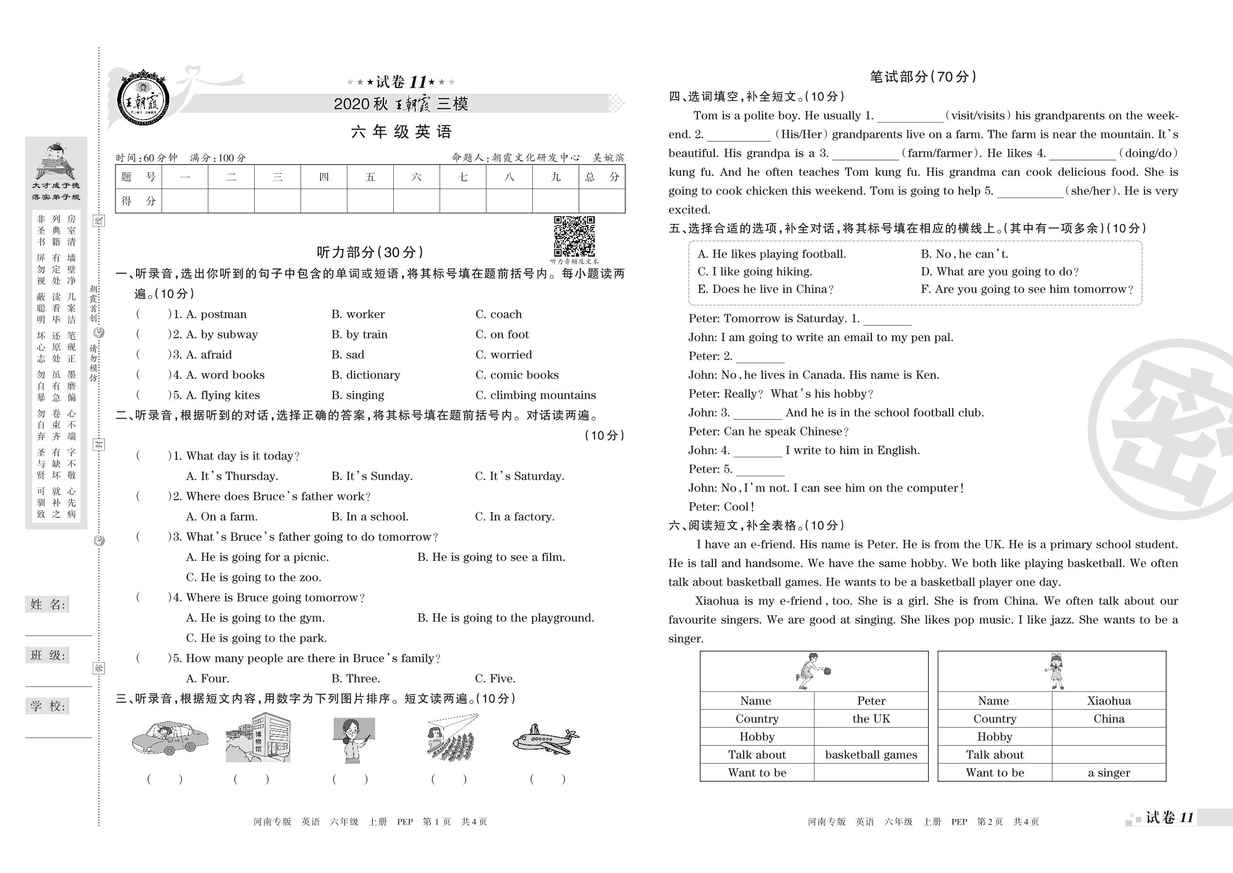 王朝霞期末模拟卷六年级上册英语(PEP版)_R210807160932【11】