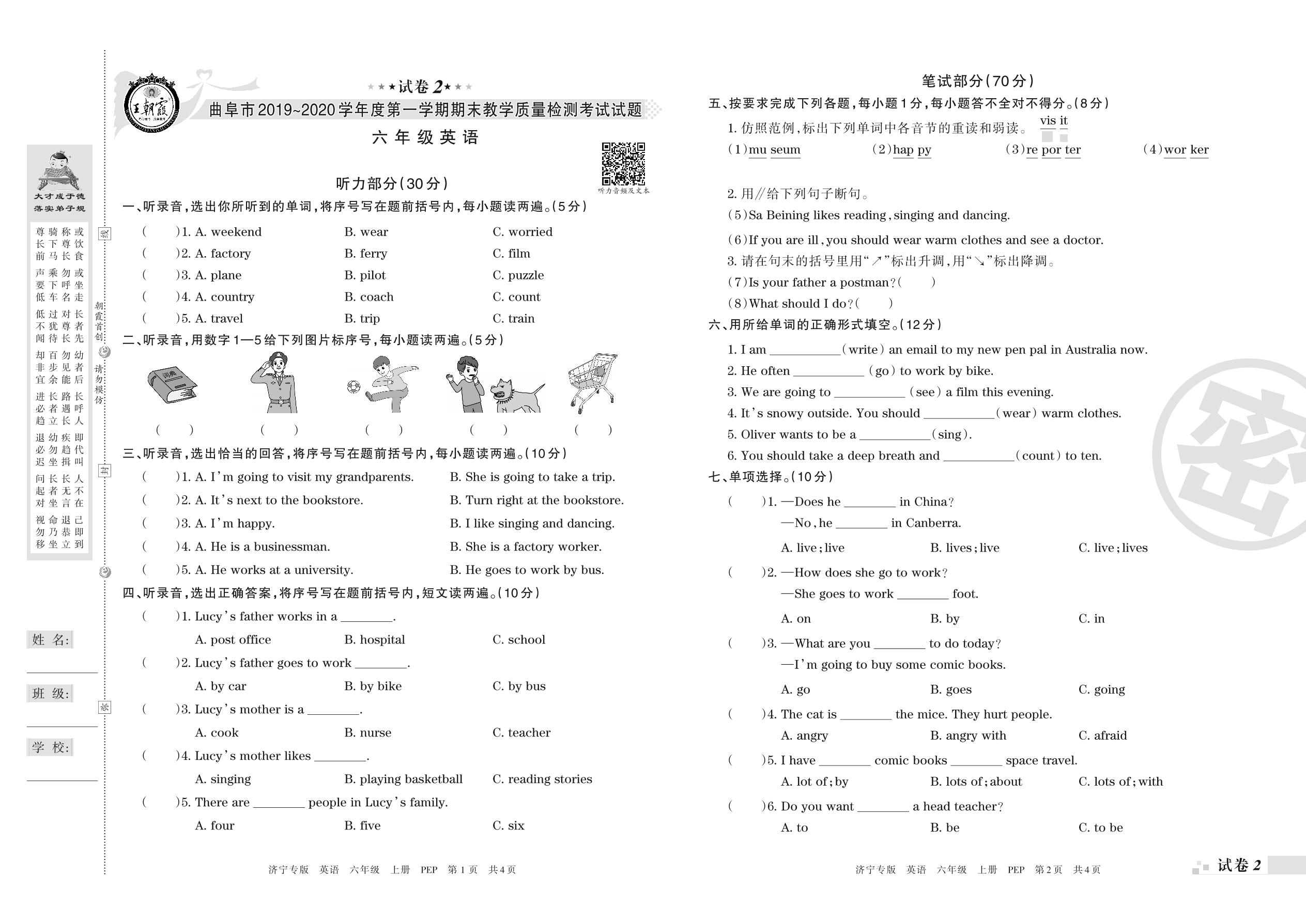 2019-2020学年第一学期曲阜市六年级英语试卷(PEP版)【2】
