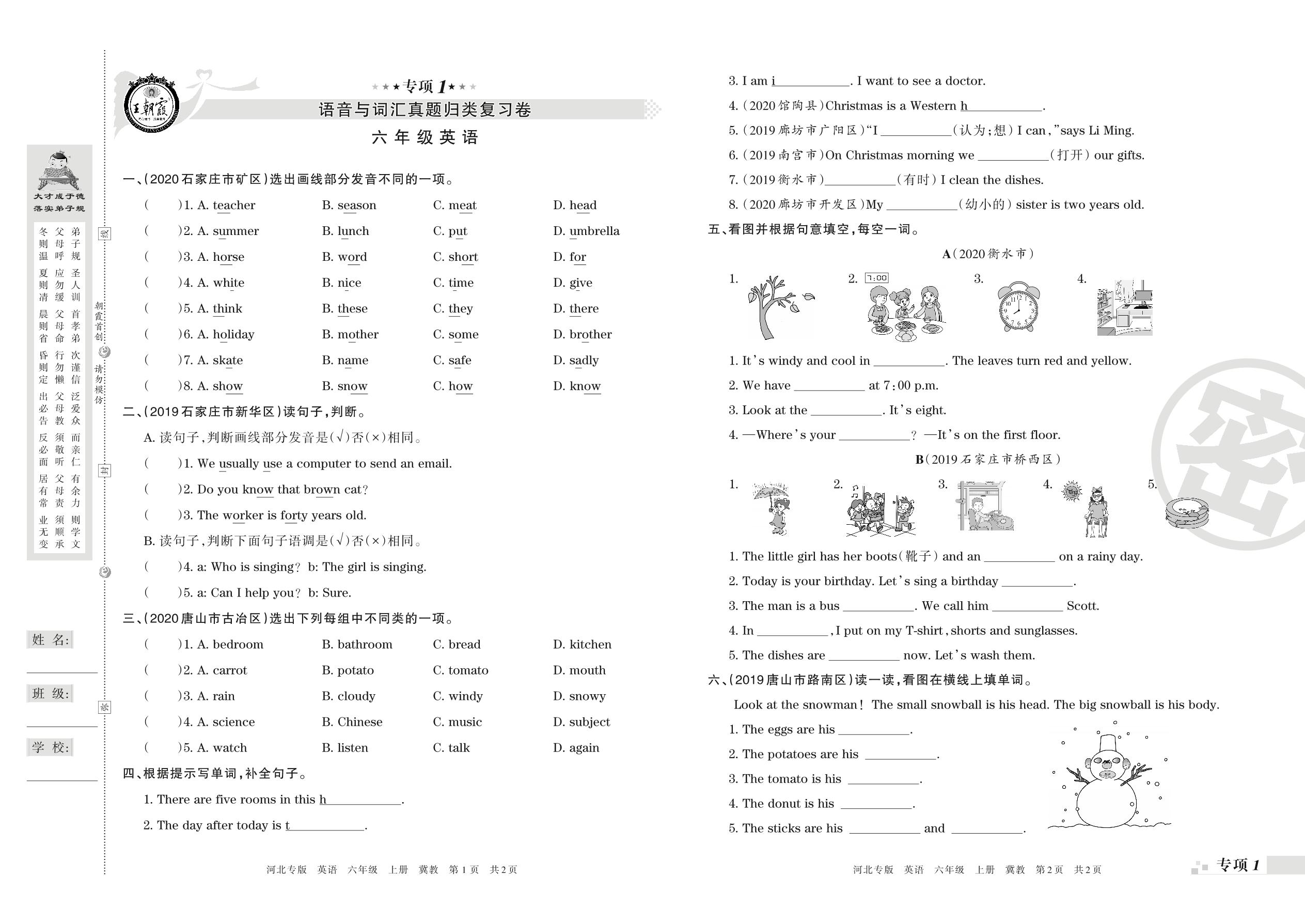 王朝霞期末专项卷——语音与词汇、句子真题归类复习六年级上册英语(冀教版)【0】